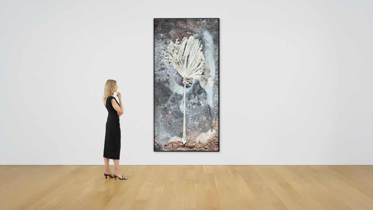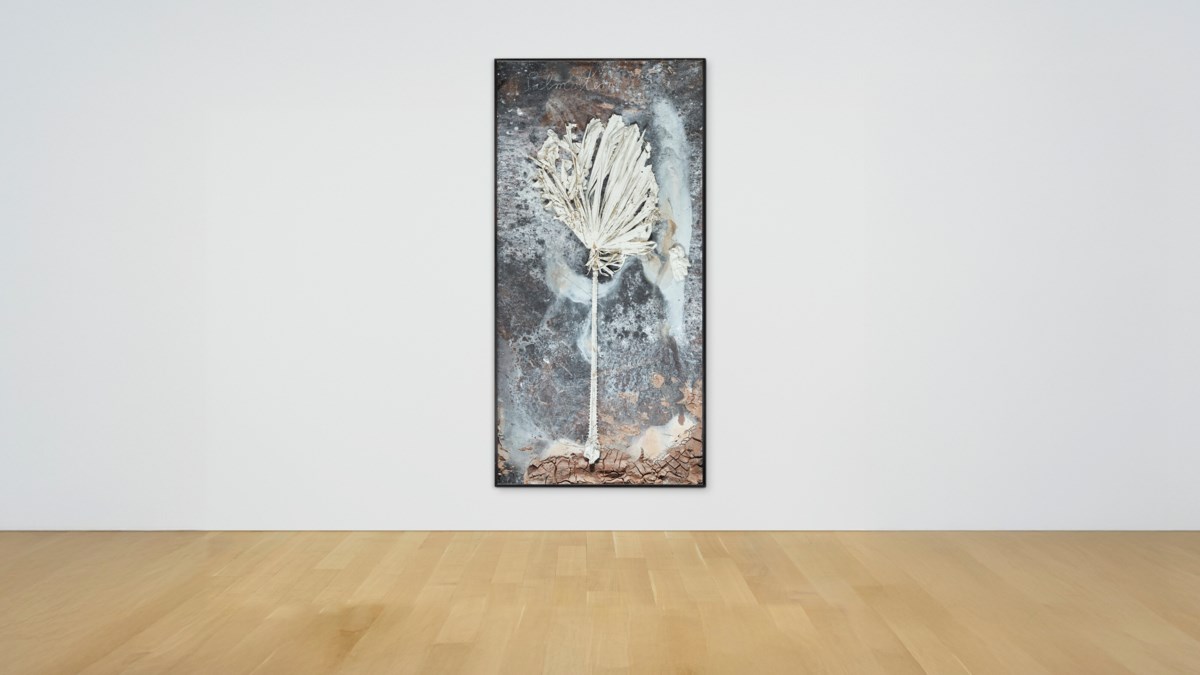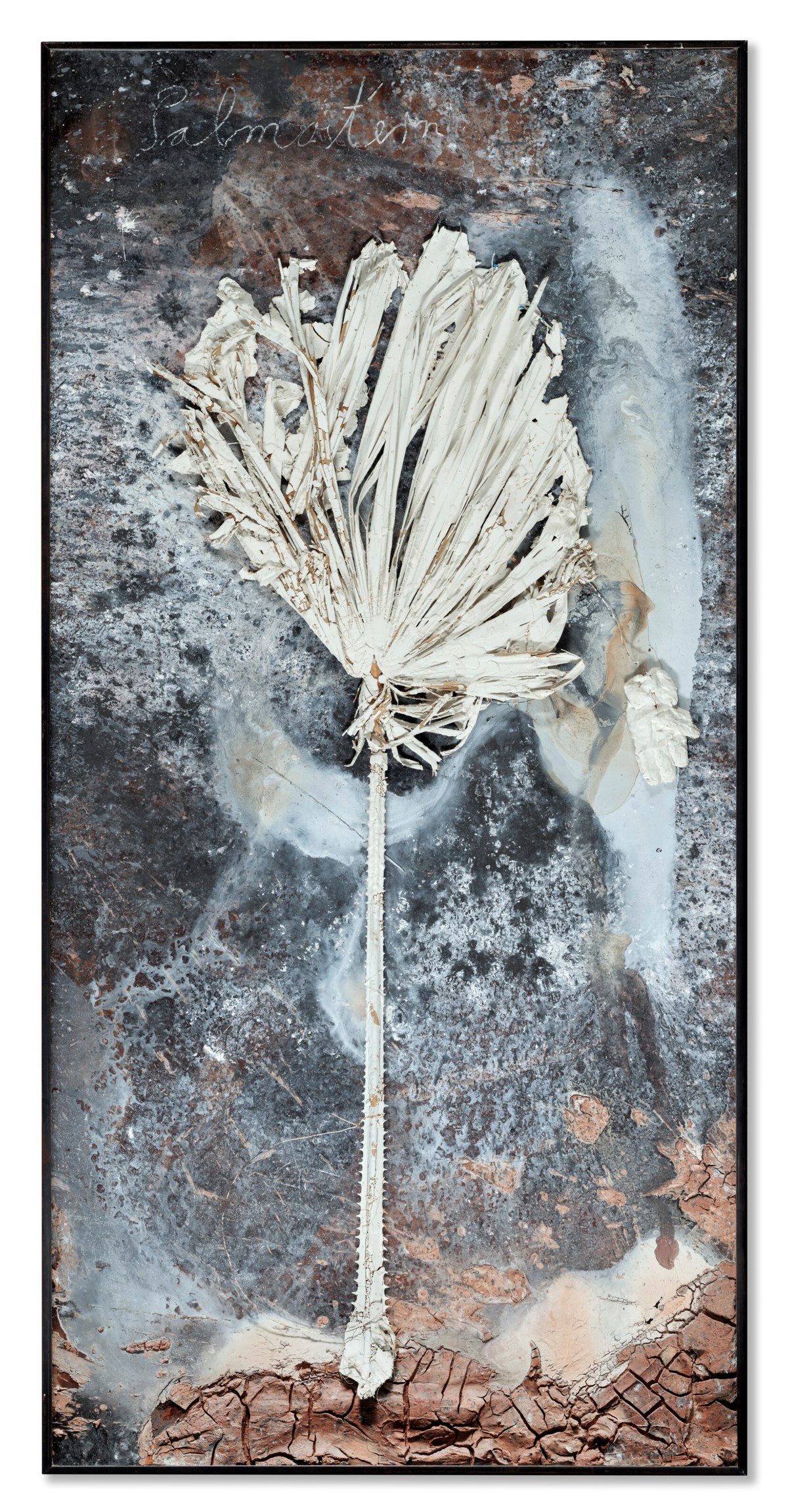 Anselm Kiefer's *Palmsonntag* is a monumental and richly textured work that incorporates oil, emulsion, plaster, red clay, and an actual palm leaf embedded into the surface of the canvas, mounted on panel within a frame crafted by the artist himself. The layered materials create a deeply atmospheric, almost archaeological surface that evokes themes of memory, spirituality, and the passage of time. Kiefer's characteristic use of organic and earthly elements transforms the work into a powerful meditation on ritual and resurrection, referencing the religious significance of Palm Sunday.