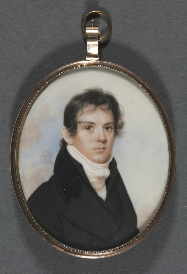 Exemplifying the popularity of miniature portraits in early America, this work shows Dickinson's skill in rendering masculine features with the delicate precision required for ivory painting.