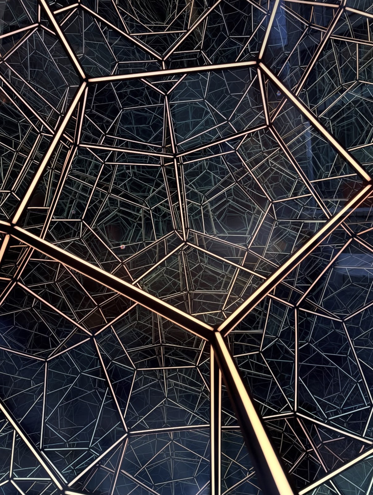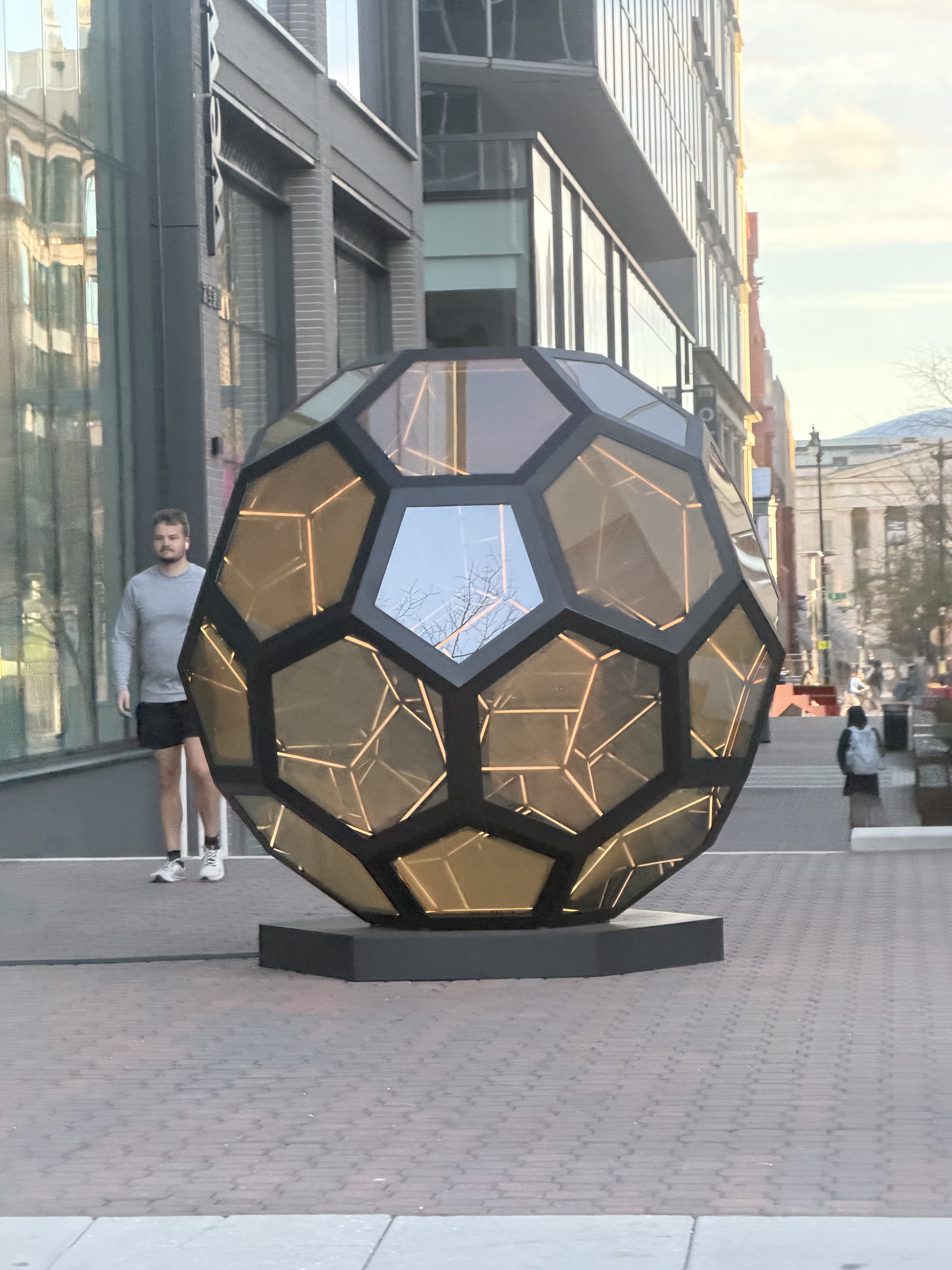 A monumental 70-inch dodecahedron sculpture by Anthony James, composed of twelve pentagonal glass-and-steel faces filled with an intricate internal lattice of gold-toned geometric patterning illuminated by warm LED light. The work references sacred geometry and crystalline structures, creating a mesmerizing infinity-mirror-like interior visible through each faceted panel. Mounted on a low black plinth, the sculpture is sited outdoors in Downtown Washington, D.C., in front of a neoclassical civic building. James is known for large-scale geometric light sculptures that merge mathematical precision with transcendent visual experience.