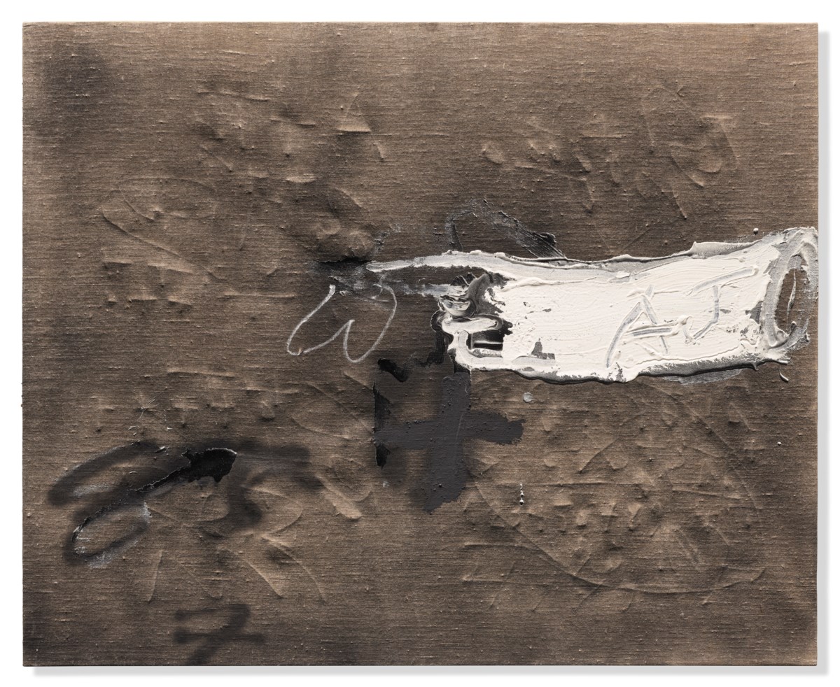 A dynamic interplay of raw materiality and gestural mark-making defines this work, where layers of oil paint are scraped and scratched through the grattage technique to reveal underlying strata of pigment and texture. Tàpies incorporates graphite scrawls that evoke the spontaneous, anonymous quality of street graffiti, blurring the boundary between fine art and urban expression. The stark contrast of dark marks against white ground reinforces the artist's signature meditation on surface as a site of memory, erasure, and human presence.