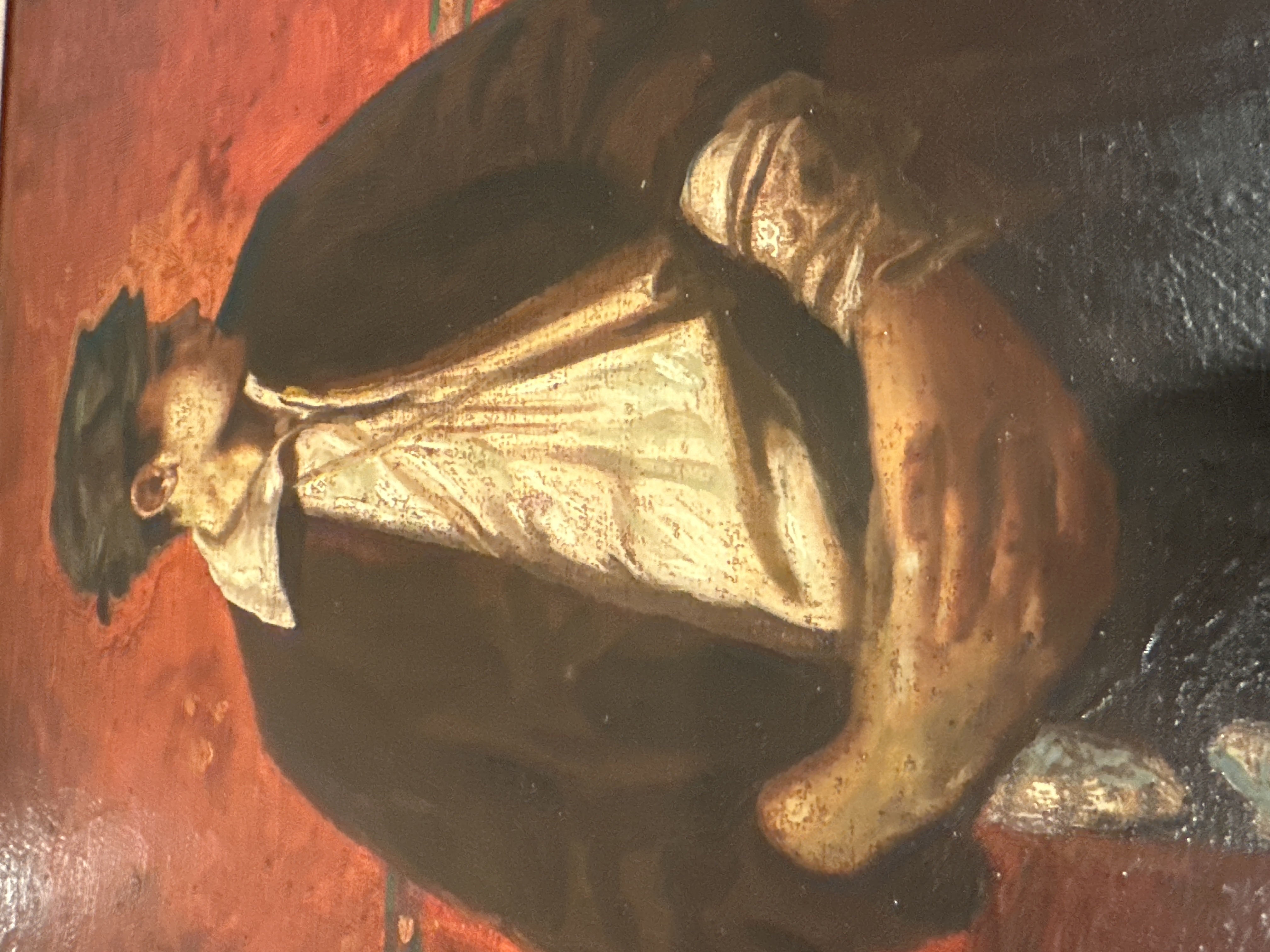 This evocative oil painting by Italian master Antonio Mancini depicts a young street urchin (scugnizzo) in a humble interior setting with a warm red-toned background. The barefoot youth, dressed in dark clothing with a white collar, stands in contemplation near discarded objects including bottles and fabric. Mancini was renowned for his empathetic portrayals of Naples' working-class children, and this work exemplifies his distinctive thick impasto technique and masterful use of light and shadow.