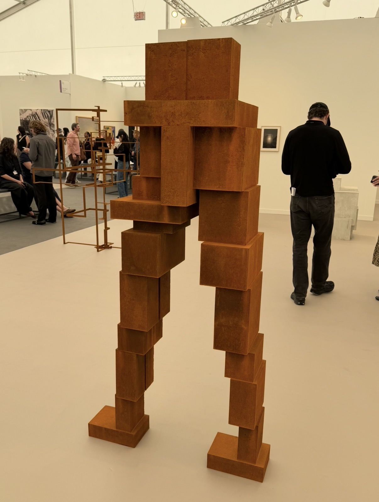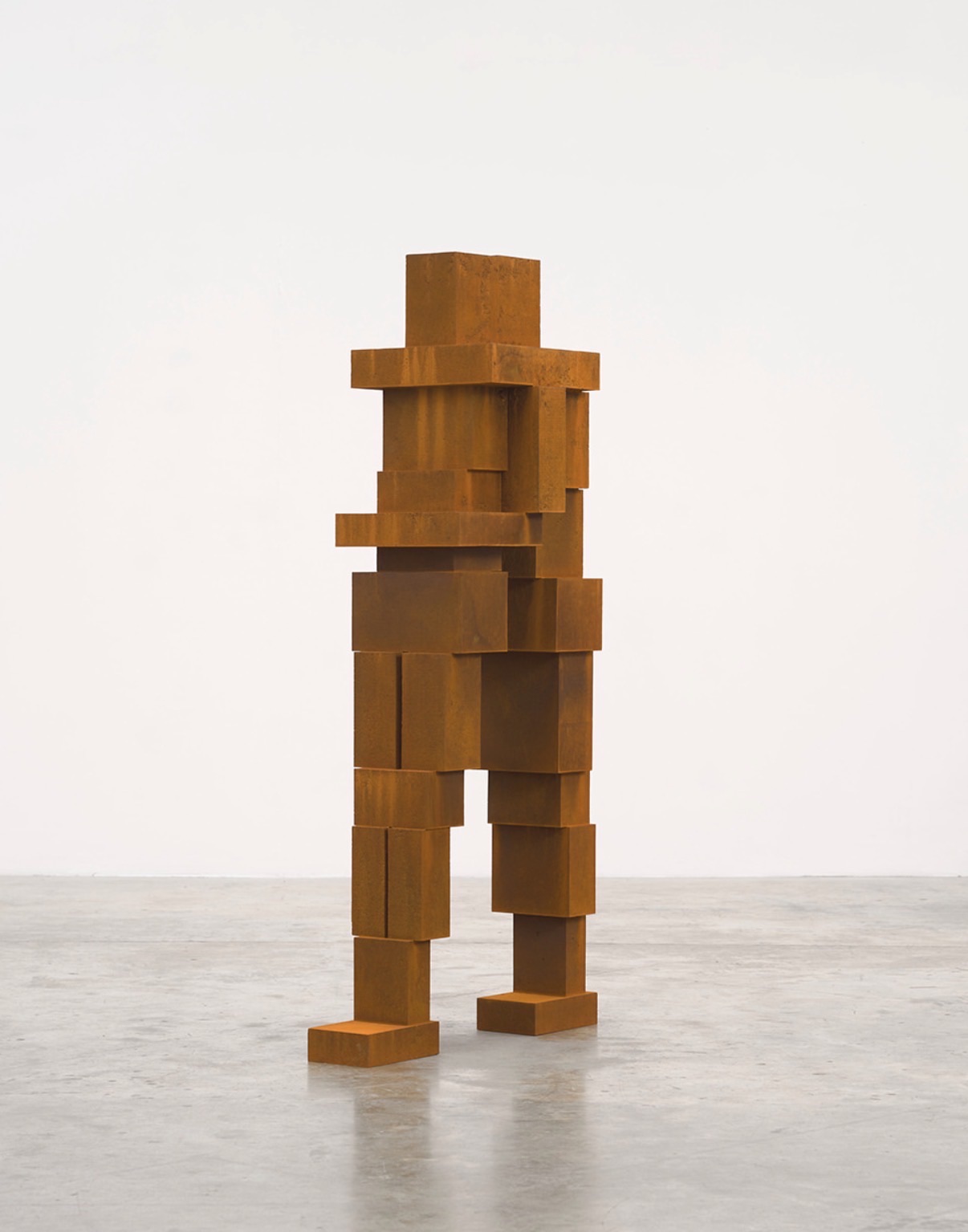 BUTTRESS is a monumental abstract sculpture by Antony Gormley, composed of stacked geometric forms in cast iron. The work exemplifies Gormley's ongoing exploration of the human body through architectural and geometric abstraction. The rusted patina of the iron gives the sculpture a weathered, industrial quality while the humanoid configuration maintains the artist's signature investigation of corporeality and spatial presence.