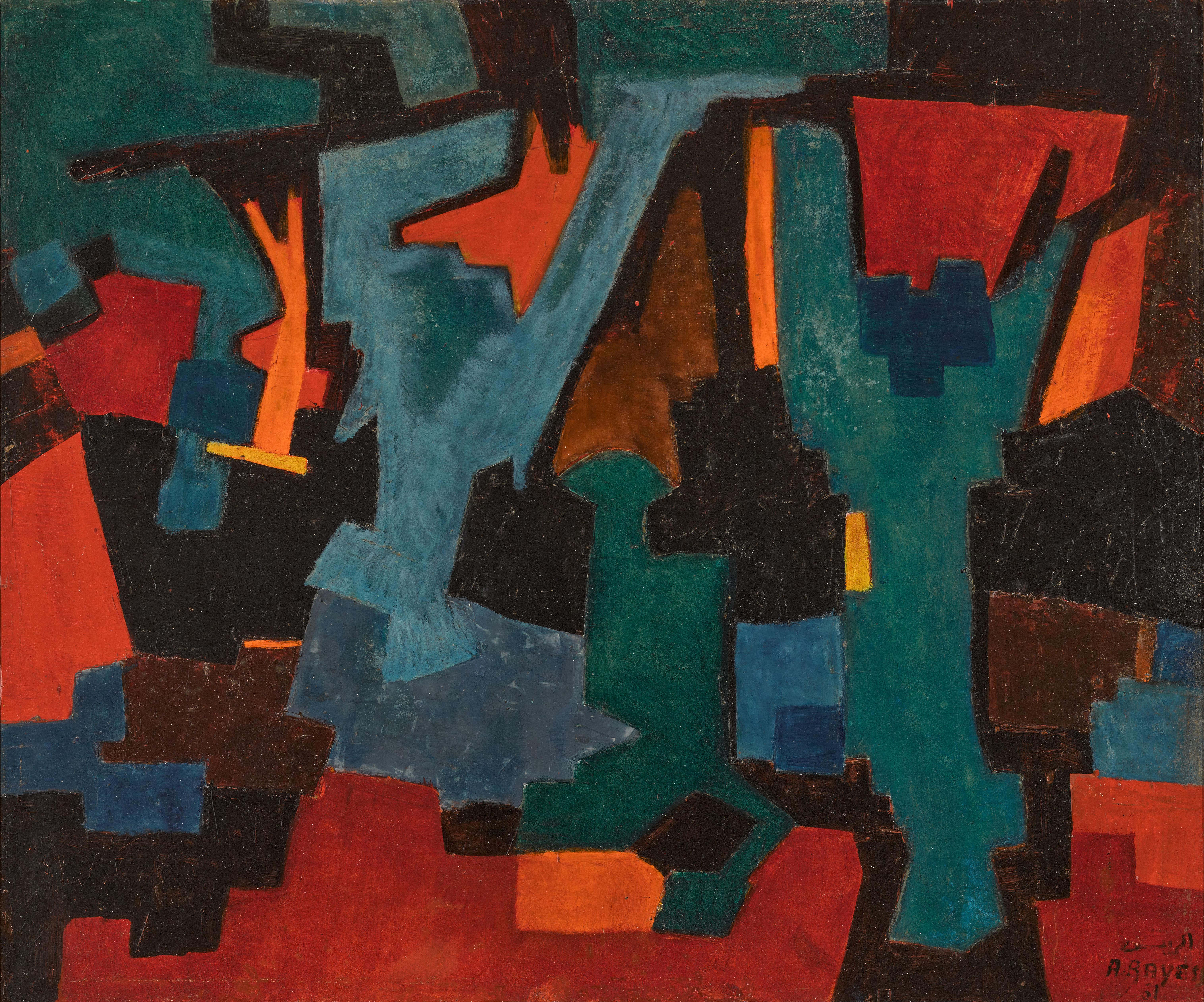 Aref El Rayess's 'Untitled (Abstract)' (1961) is an oil painting on board that demonstrates the artist's abstract expressionist approach. The work reflects his exploration of non-representational forms and color relationships.