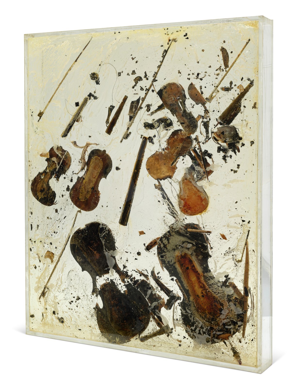 A chaotic assemblage of burned and charred violins, a violoncello, and bows are encased in clear Plexiglass and preserved in resin, creating a striking tension between destruction and permanence. Arman, known for his accumulations and manipulations of objects, transforms these classical instruments into a meditation on the fragility of beauty and the violent potential of creative destruction. The scorched forms, frozen in their ruined state, evoke both loss and a haunting, sculptural elegance.