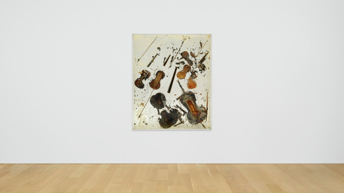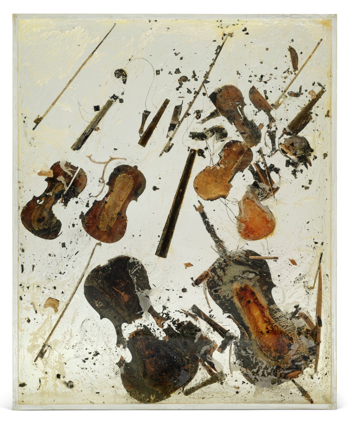 - burned violoncello, violins, and bows and resin in Plexiglass