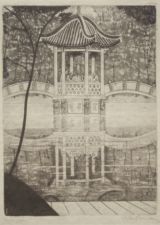 Fine linear work and tonal aquatint washes combine to create atmospheric depth in Paunzen's early 20th-century printmaking exploration.