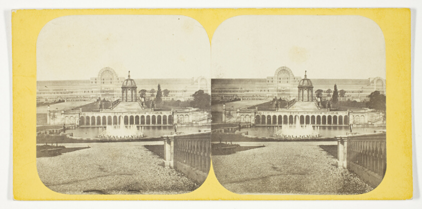 Documentary photograph preserves the marvel of the 1851 Great Exhibition's revolutionary iron and glass architecture alongside its spectacular water features.