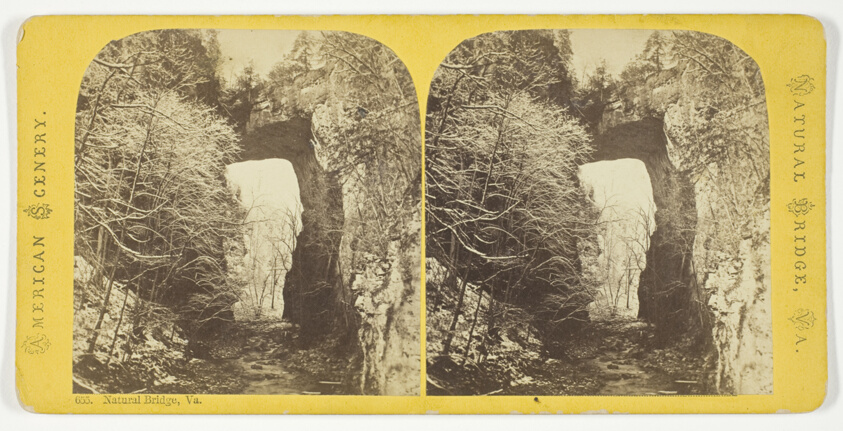 Geological wonder meets photographic innovation as Virginia's Natural Bridge becomes a popular stereo subject, combining tourism with technological marvel.