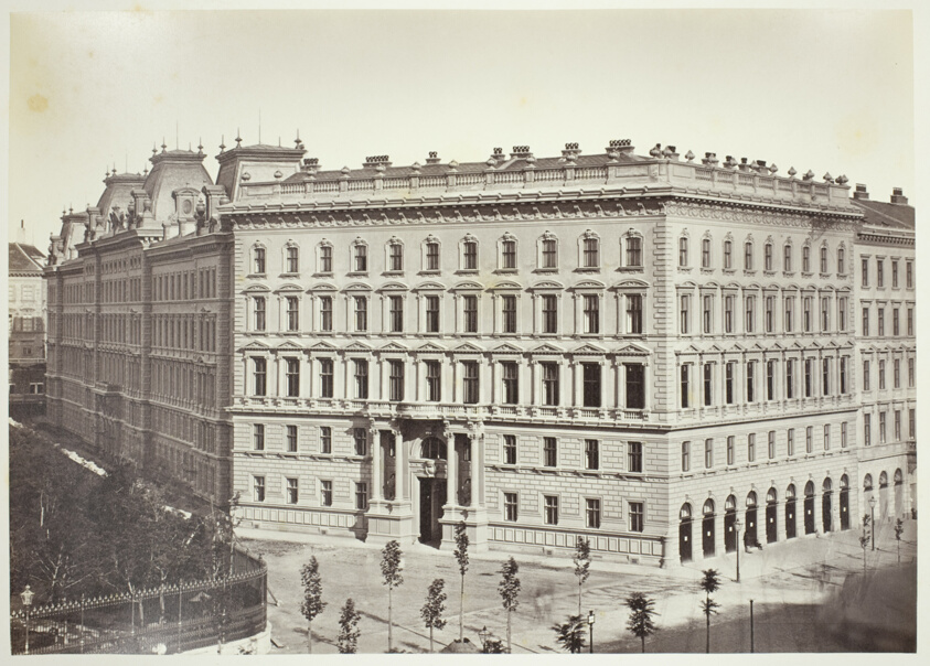 Featuring the elaborate façade of a nobleman's residence on Vienna's prestigious Opera Ring, this photograph demonstrates the albumen process's ability to capture fine architectural details.