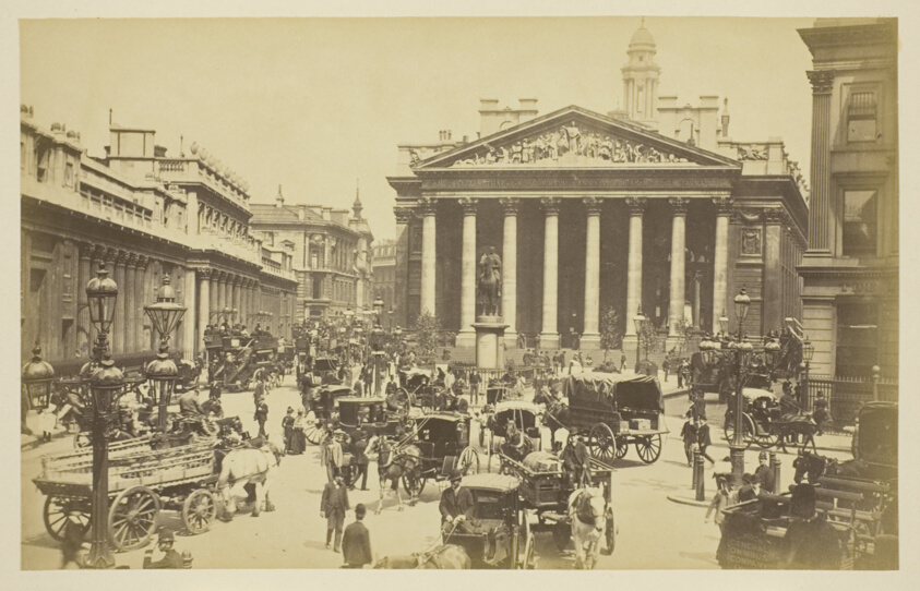 Capturing the commercial heart of Victorian London, this albumen print showcases both the grandeur of the Exchange's neoclassical architecture and photography's role in urban documentation.