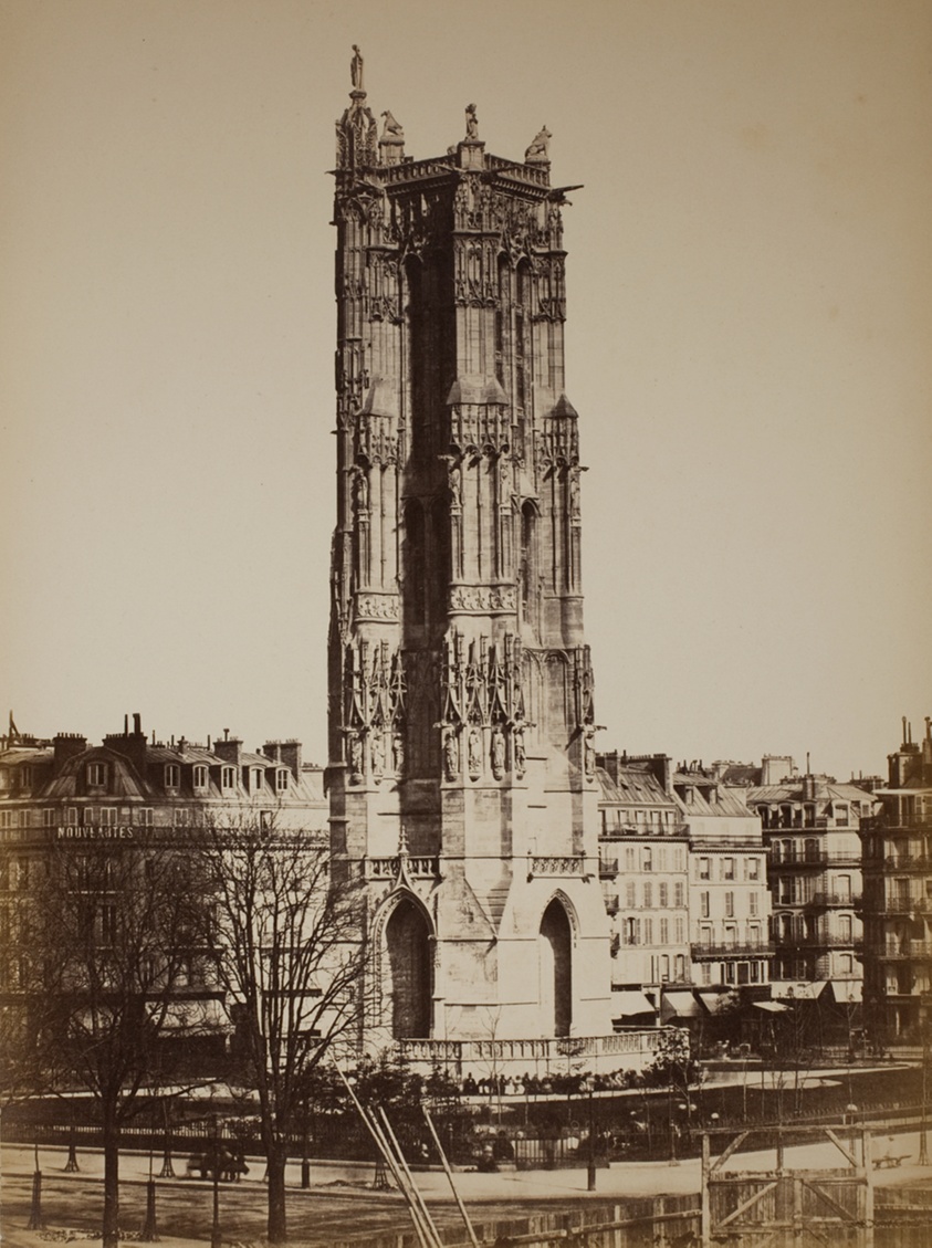 Standing as one of Paris's few surviving medieval monuments, Tour St. Jacques is documented with the exceptional clarity that made albumen prints the preferred medium for architectural photography.