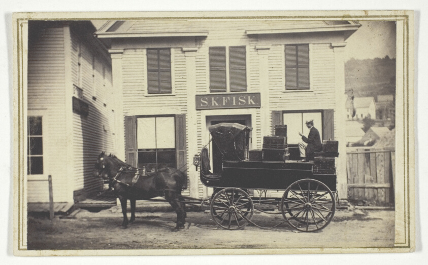 Captured on a carte-de-visite format, this intimate albumen print documents American commercial life with a storefront and horse-drawn delivery wagon, representing the era's burgeoning retail culture.