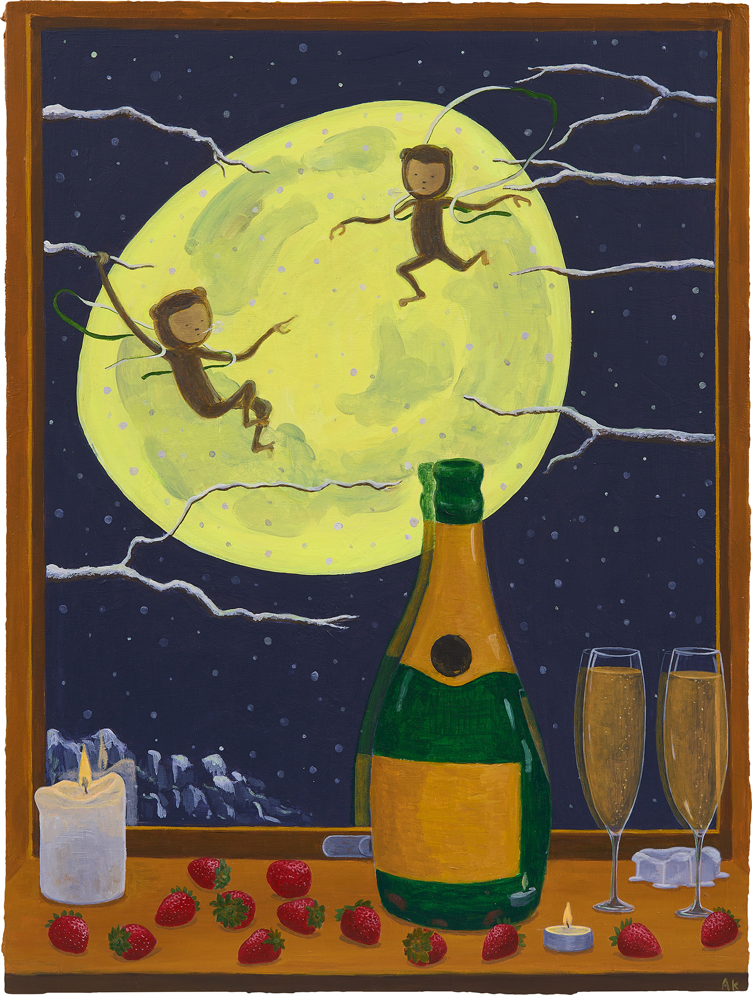 Atsushi Kaga's 'Two Monkeys in Winter' is an acrylic on board painting from 2020 depicting animals in a winter landscape. The work captures a moment of animal behavior within a seasonal setting.