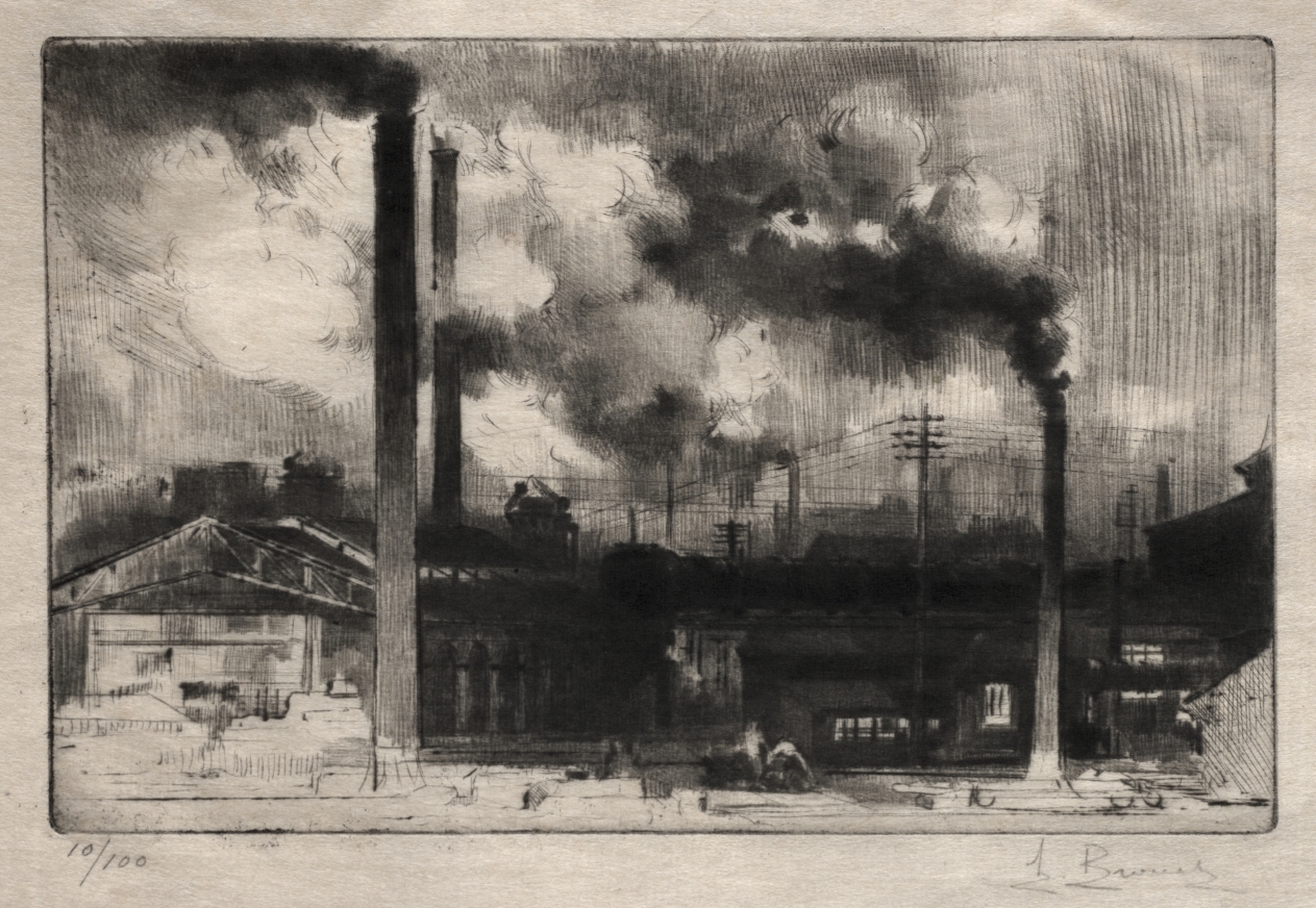 Documenting France's industrial transformation, this multi-technique print demonstrates Brouet's mastery of various etching methods to create dramatic atmospheric effects.