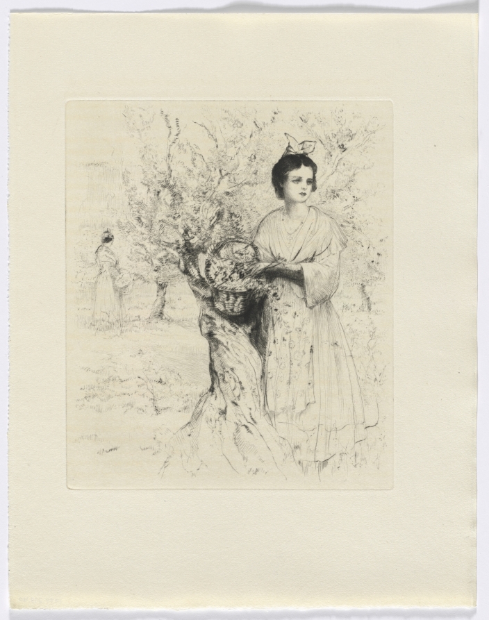 This etching by Auguste Brouet illustrates a passage from Frédéric Mistral's autobiographical work, depicting a woman positioned outdoors carrying a basket brimming with flowers. Brouet's delicate handling of the etching medium captures fine details and atmospheric effects through careful line work, conveying both the figure and her natural surroundings with sensitivity. The work exemplifies the early twentieth century practice of commissioning original prints to accompany literary texts, enhancing the reader's engagement with the narrative.
