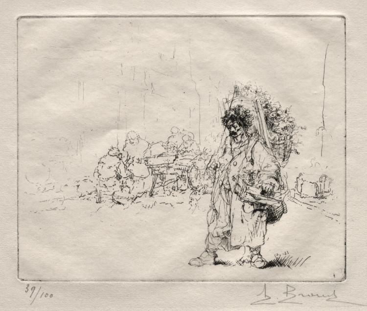 A basket-carrying merchant embodies Brouet's sympathetic portrayal of Paris's street vendors and their essential role in urban commerce.