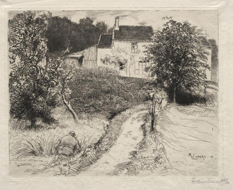 A wartime etching that captures the somber mood of France during World War I through Lepère's sensitive handling of light and atmosphere.