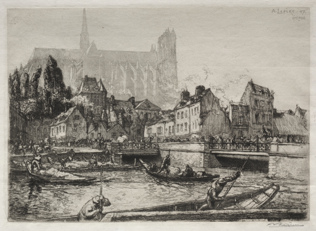 Part of Lepère's documentation of French regional life, this etching captures the daily commerce of vegetable vendors arriving in the historic city of Amiens.