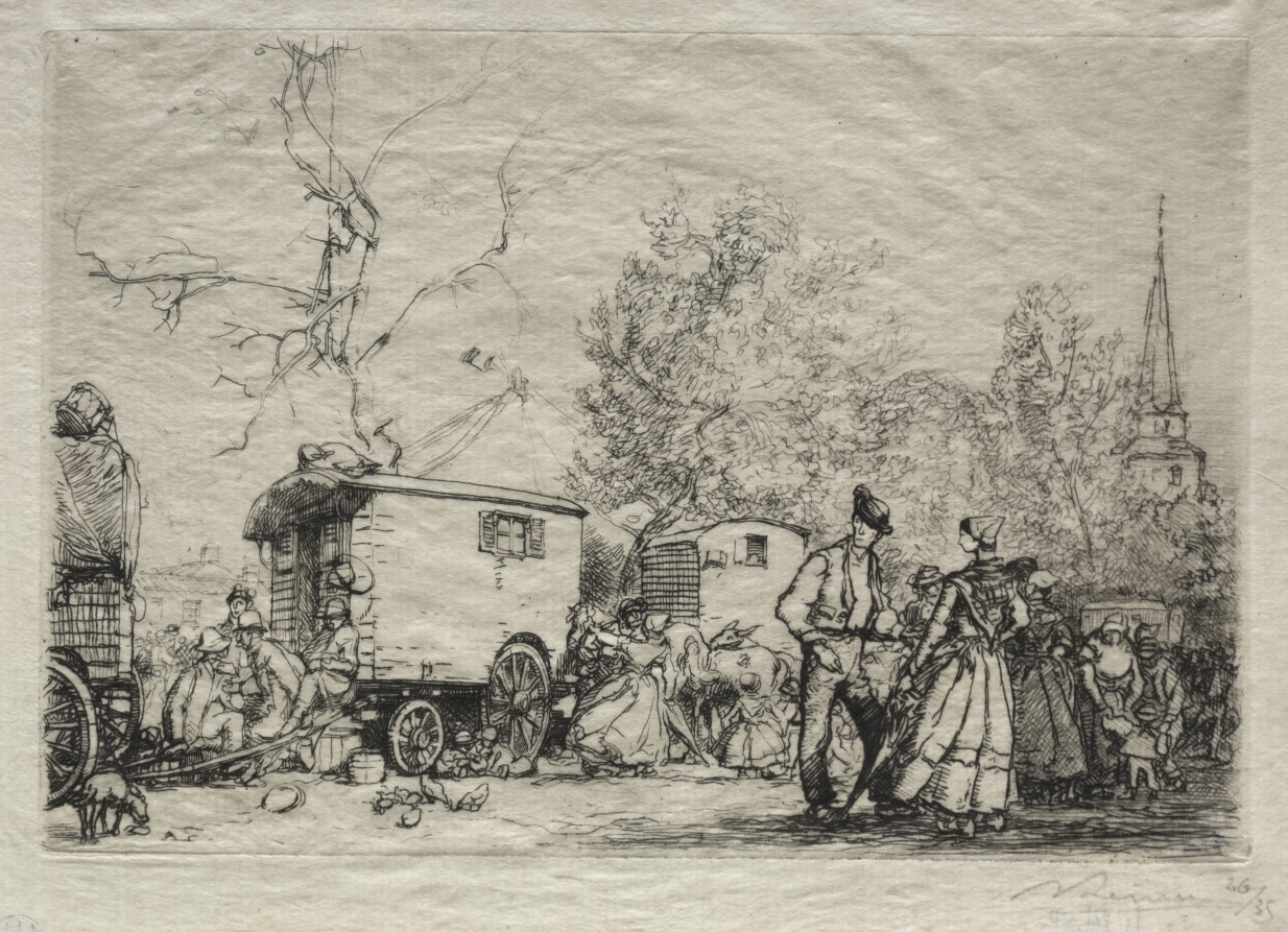 Executed in etching rather than his signature wood engraving technique, this fair scene reveals Lepère's skill at capturing the animated atmosphere of French provincial life.