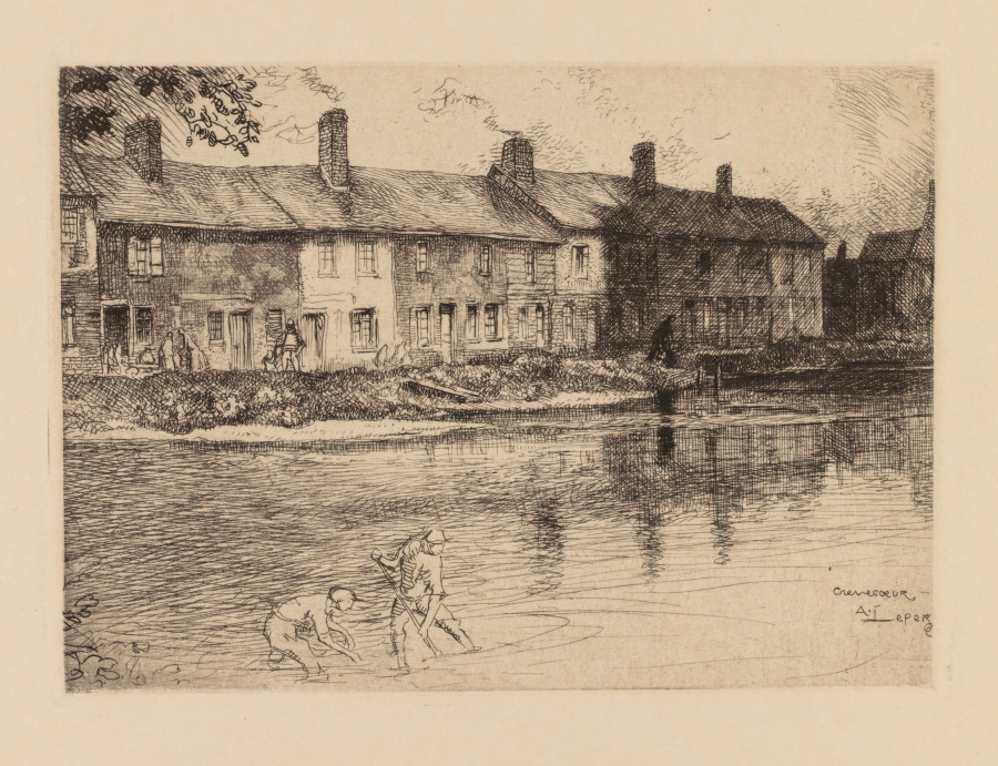 This etching by Auguste Louis Lepère depicts a pastoral pond scene in the Picardie region of France, showcasing the artist's skillful use of line work to capture the quiet beauty of rural landscape. Lepère, a master printmaker of the late 19th century, employs the etching medium to render atmospheric effects and naturalistic detail through carefully controlled plate marks and tonal variations. The work is part of a bound portfolio containing seven etchings, demonstrating Lepère's commitment to creating cohesive series that explore the French countryside.