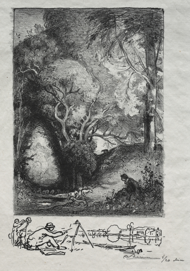 Rare among Lepère's prints for its lithographic technique, this late work shows the artist experimenting with the medium's distinctive textural possibilities.