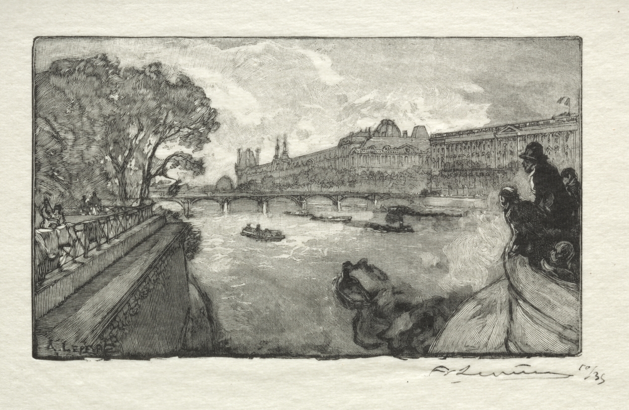 Capturing an iconic Parisian vista, this wood engraving demonstrates Lepère's ability to balance architectural precision with the bustling energy of city life along the Seine.