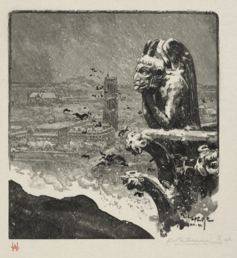 Featuring the famous gargoyle of Notre-Dame, this wood engraving combines Gothic Revival interest in medieval architecture with Lepère's distinctive printmaking virtuosity.