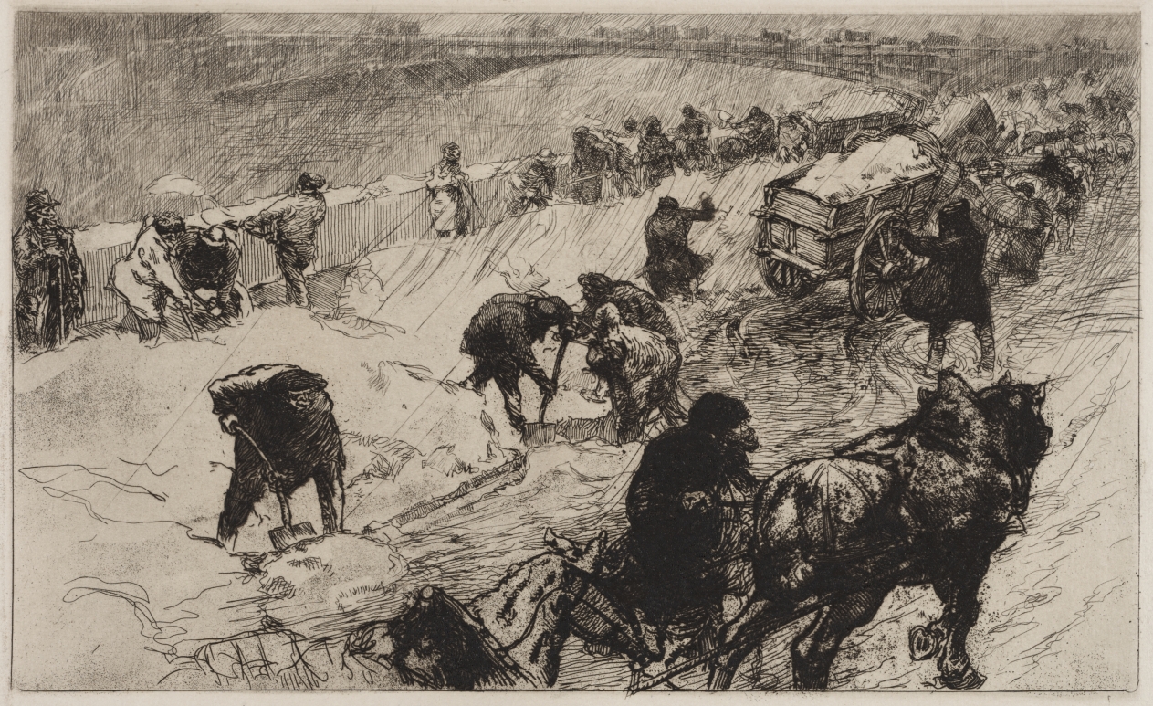 Winter recreation transforms the same Parisian location into a scene of playful community, demonstrating etching's ability to capture both atmosphere and human activity.