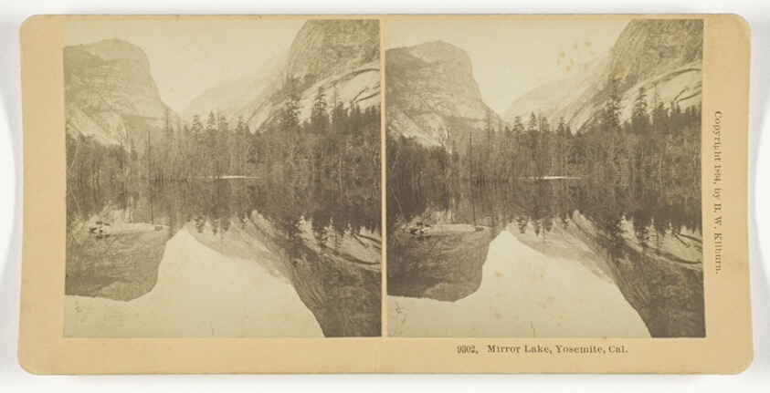 Yosemite's serene beauty receives the stereocard treatment, allowing Victorian viewers to experience the famous valley's reflective tranquility in three dimensions.