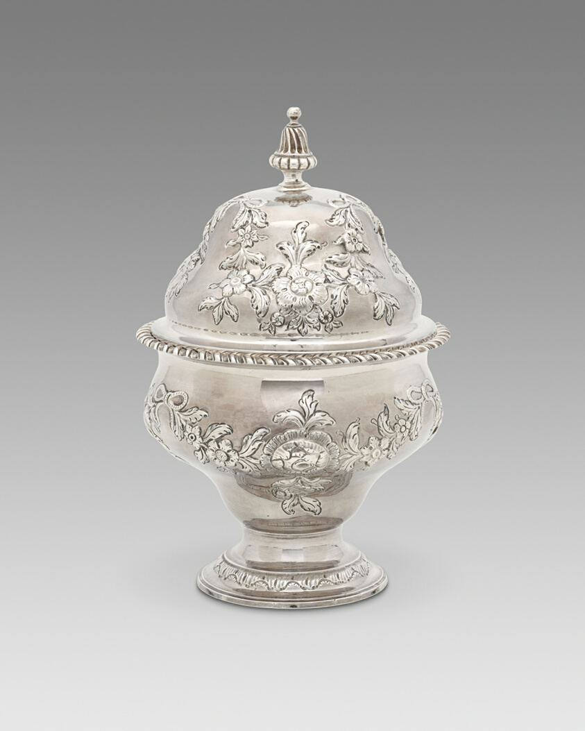 Wealthy colonists ordered silver sugar dishes and cream pots to complement their English ceramic or Chinese export porcelain tea or coffeepots. Complete matching tea sets were not common until the late 18th century. The double-bellied form of these objects was popular throughout the colonies during the Rococo period. The decoration, called chasing, was achieved by working the surface with a small hammer and chisels.