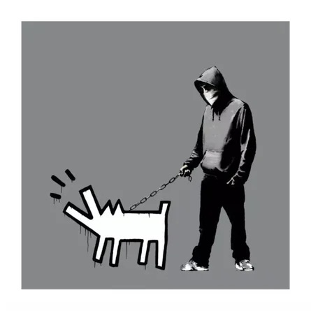 This is Banksy's iconic *Choose Your Weapon* (also known as *Barking Dog*), a stencil-based work that cleverly appropriates Keith Haring's signature barking dog motif, leashed to a hooded youth — a pointed commentary on the commodification of street art and urban tension. Executed in Banksy's characteristic monochromatic palette with sharp stencil precision, the piece exemplifies his subversive wit and art-historical literacy that define the contemporary urban art movement. This image is among Banksy's most recognizable and widely reproduced compositions, with authenticated screenprint editions commanding significant prices at auction and representing a cornerstone holding for any serious collection of 21st-century street art.