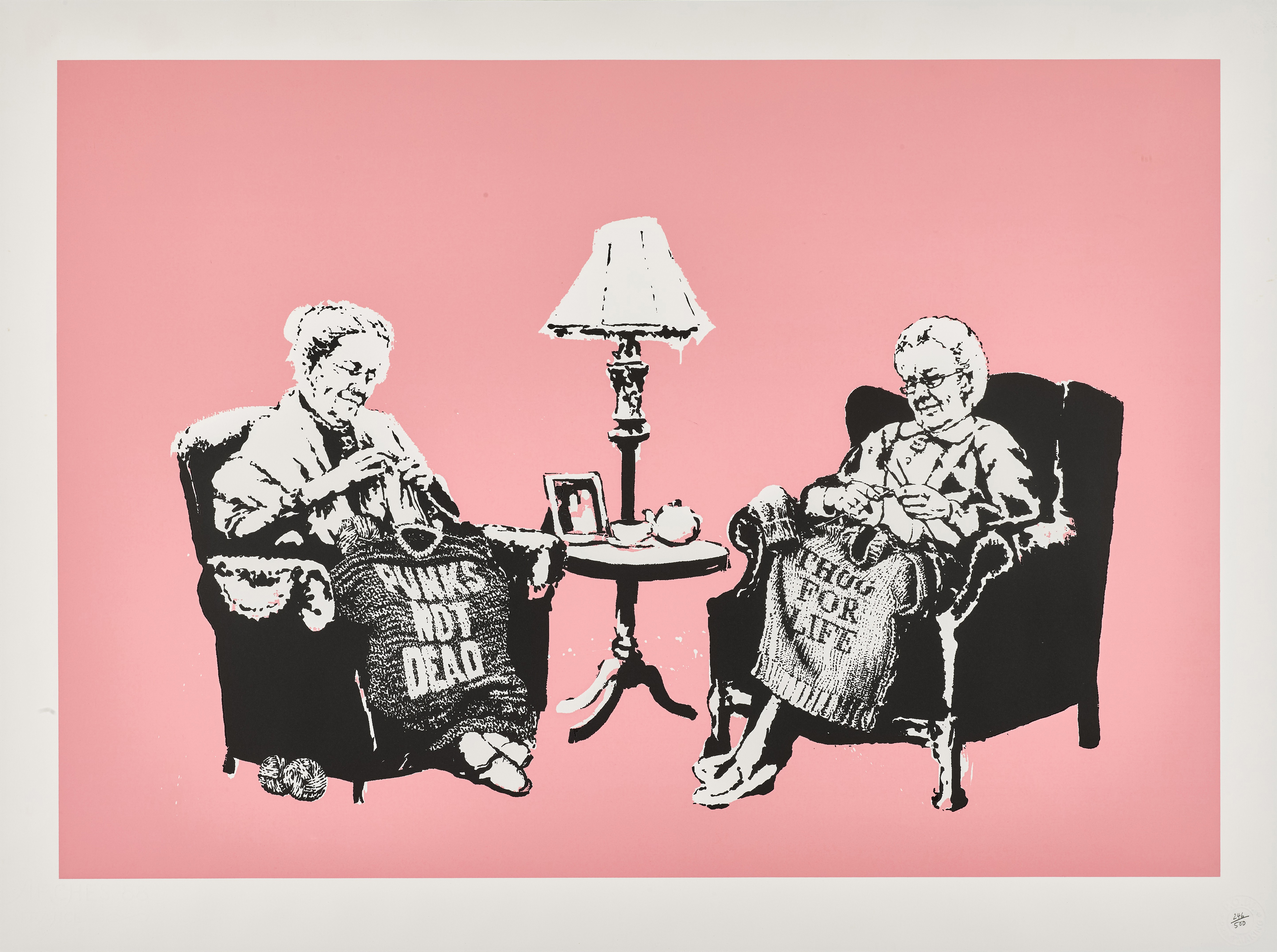 A 2006 screenprint by Banksy depicting elderly women, numbered 246/500 and published by Pictures on Walls. The work is printed on Arches wove paper and presented in a frame.