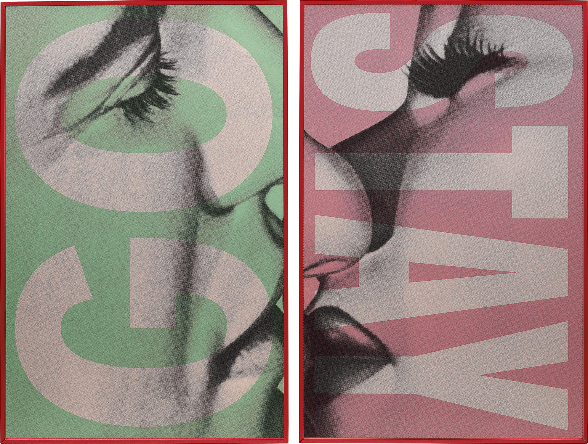 Two large-scale chromogenic prints are presented side by side as a diptych, featuring Kruger's signature bold, black-and-white photography overlaid with stark red-and-white text. The words "Stay" and "Go" command the viewer with Kruger's characteristically confrontational graphic language, borrowed from the visual vocabulary of advertising and mass media. The artist's frames further assert her control over the work's presentation, reinforcing her ongoing interrogation of power, desire, and the directives that govern human behavior.