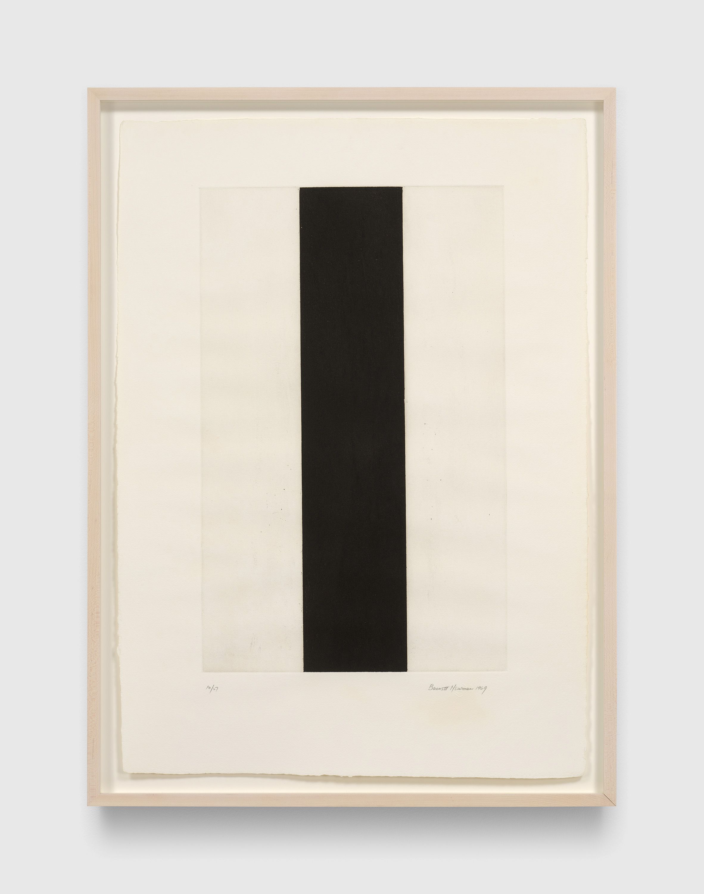 An abstract etching and aquatint composition featuring bold geometric forms and stark contrasts. The work exemplifies Newman's characteristic exploration of color field and minimalist abstraction.