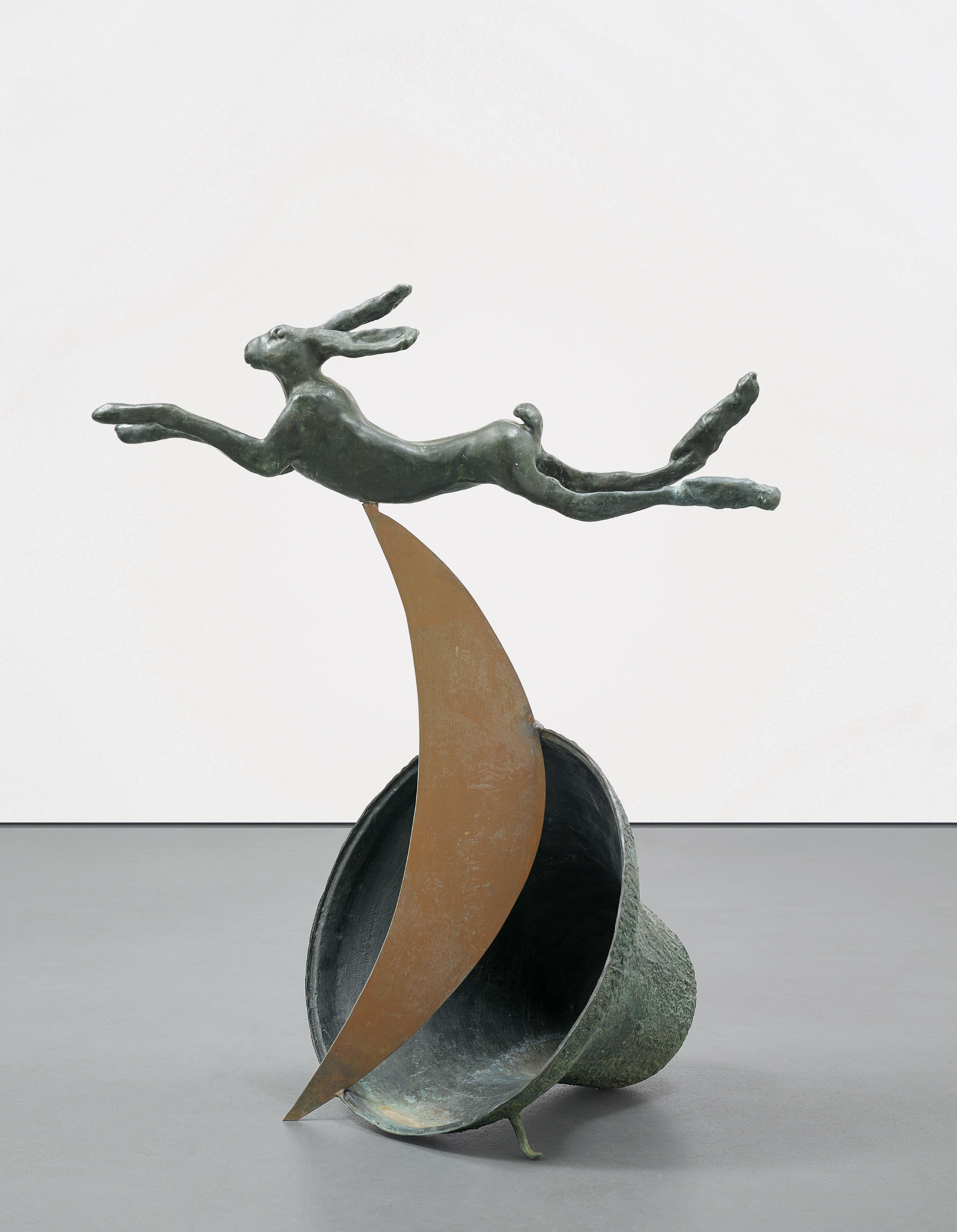 A playful bronze hare leaps dynamically atop a crescent form alongside a bell, capturing the whimsical and energetic spirit characteristic of Barry Flanagan's celebrated animal sculptures. The work exemplifies Flanagan's ability to imbue cast bronze with a sense of lightness and movement, transforming a traditionally weighty material into something full of vitality and charm. The hare, a recurring motif throughout his career, serves as a vehicle for exploring themes of freedom, imagination, and the poetic possibilities of form.