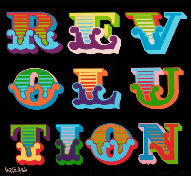 Revolution (Black) is a 2014 screenprint by Ben Eine created in multiple colors on Coventry Rag paper. The work engages with themes of social change and transformation through bold graphic treatment. The use of black as a dominant color element creates dramatic visual impact and symbolic resonance. The artist selected Coventry Rag paper to ensure the longevity and presentation quality of the print. This piece exemplifies the intersection of street art aesthetics with fine art printmaking practices.