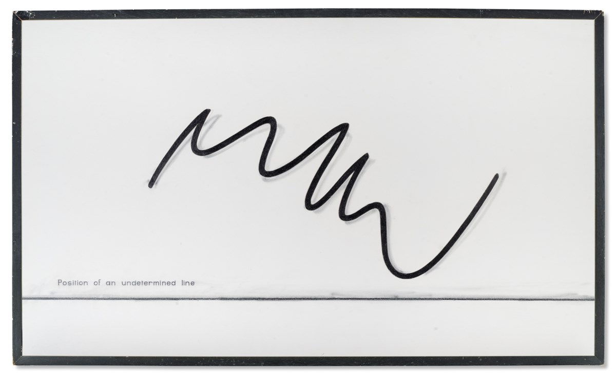 A bold, arcing line of graphite sweeps across the composition with raw, gestural energy, its trajectory neither fixed nor predictable. Fragments of cardboard are collaged onto the paper, adding a tactile, dimensional quality that disrupts the flatness of the surface. Venet's work engages with mathematical and philosophical concepts, questioning the nature of definition and certainty through the ambiguity of a line that resists precise classification.