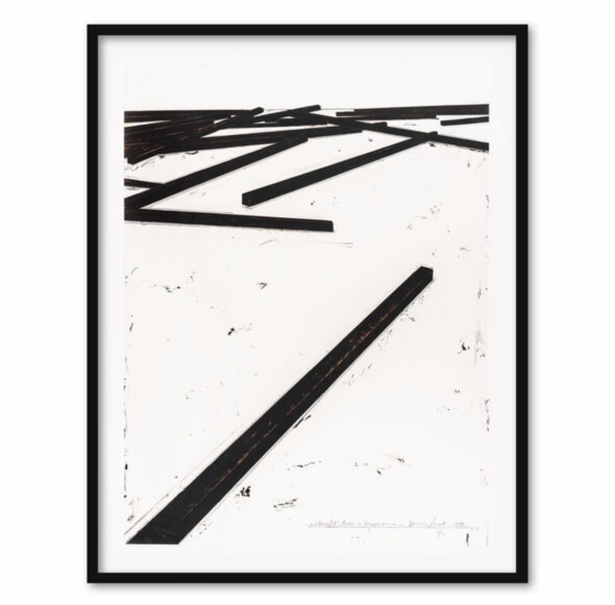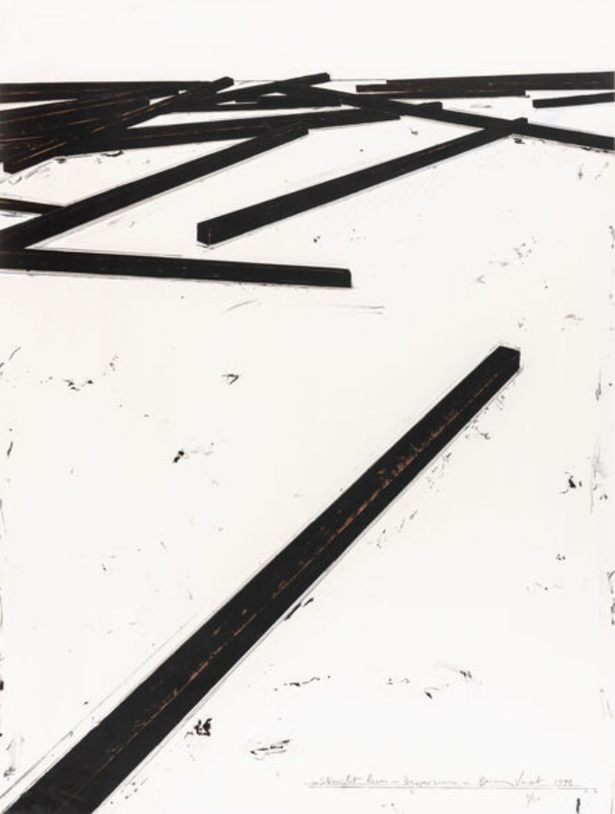 A commanding large-format silkscreen by Bernar Venet, 'Straight Lines / Dispersion' (1997) deploys bold black geometric bars radiating across a white ground in a composition that evokes both mathematical precision and physical energy. The work belongs to Venet's iconic 'Straight Lines' series, in which he investigates the conceptual and visual tension between order and scatter. Printed in an edition of 50 + 8 AP and hand-signed by the artist in pencil in the lower margin, the work is published by Dorfman Projects, New York. Offered framed and in excellent condition with a Certificate of Authenticity issued by the gallery.