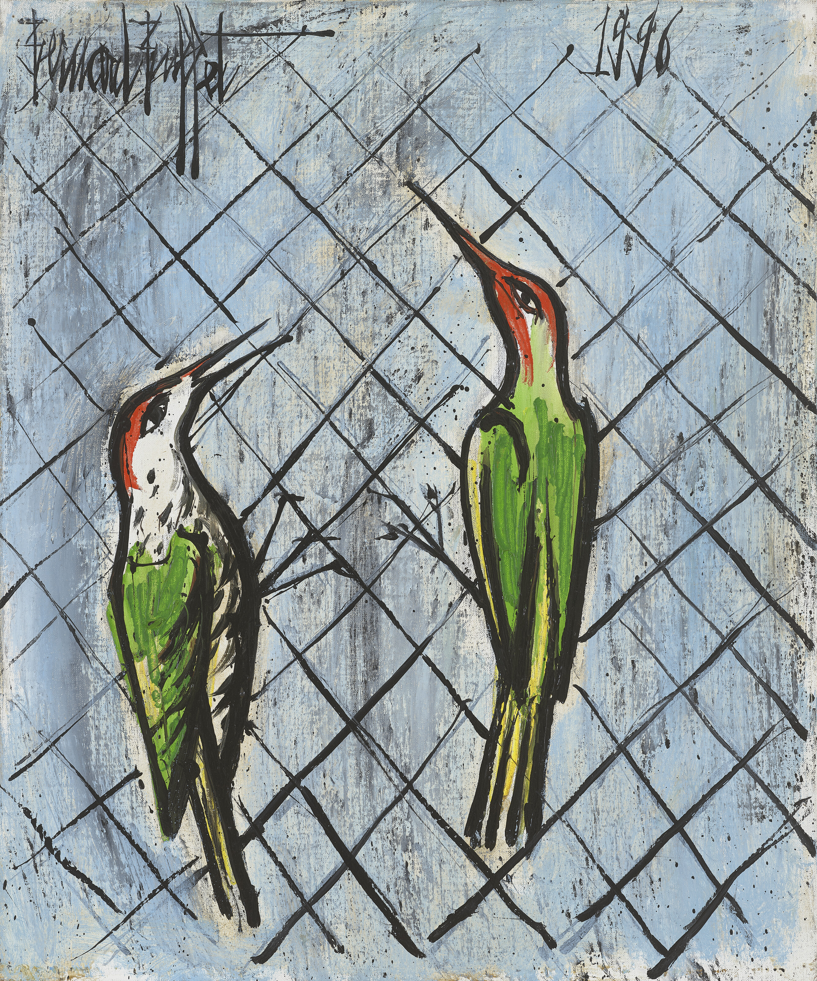 "Deux gobe-mouches" (Two Flycatchers) exemplifies Bernard Buffet's distinctive expressionist style with its characteristic angular lines and somewhat grotesque rendering of the birds. Created during the mid-20th century when Buffet was at the height of his popularity in France, the work demonstrates his preference for bold outlines and a somewhat acidic color palette that conveys psychological tension. The painting reflects Buffet's broader interest in depicting nature with an unsettling, modern sensibility rather than romantic idealization.