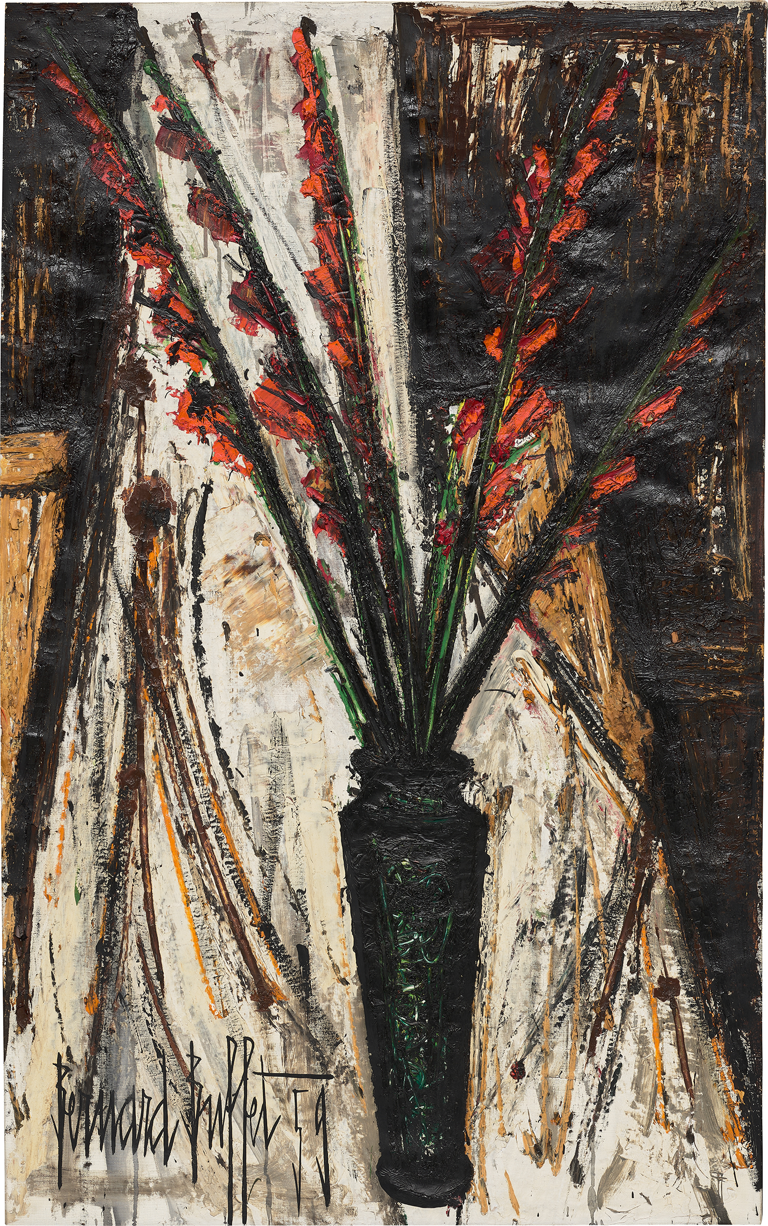 Bernard Buffet's 1959 oil painting of red gladiolus flowers showcases his distinctive expressionist style with bold outlines and vivid color. The work is characteristic of Buffet's mid-century approach to floral subjects.