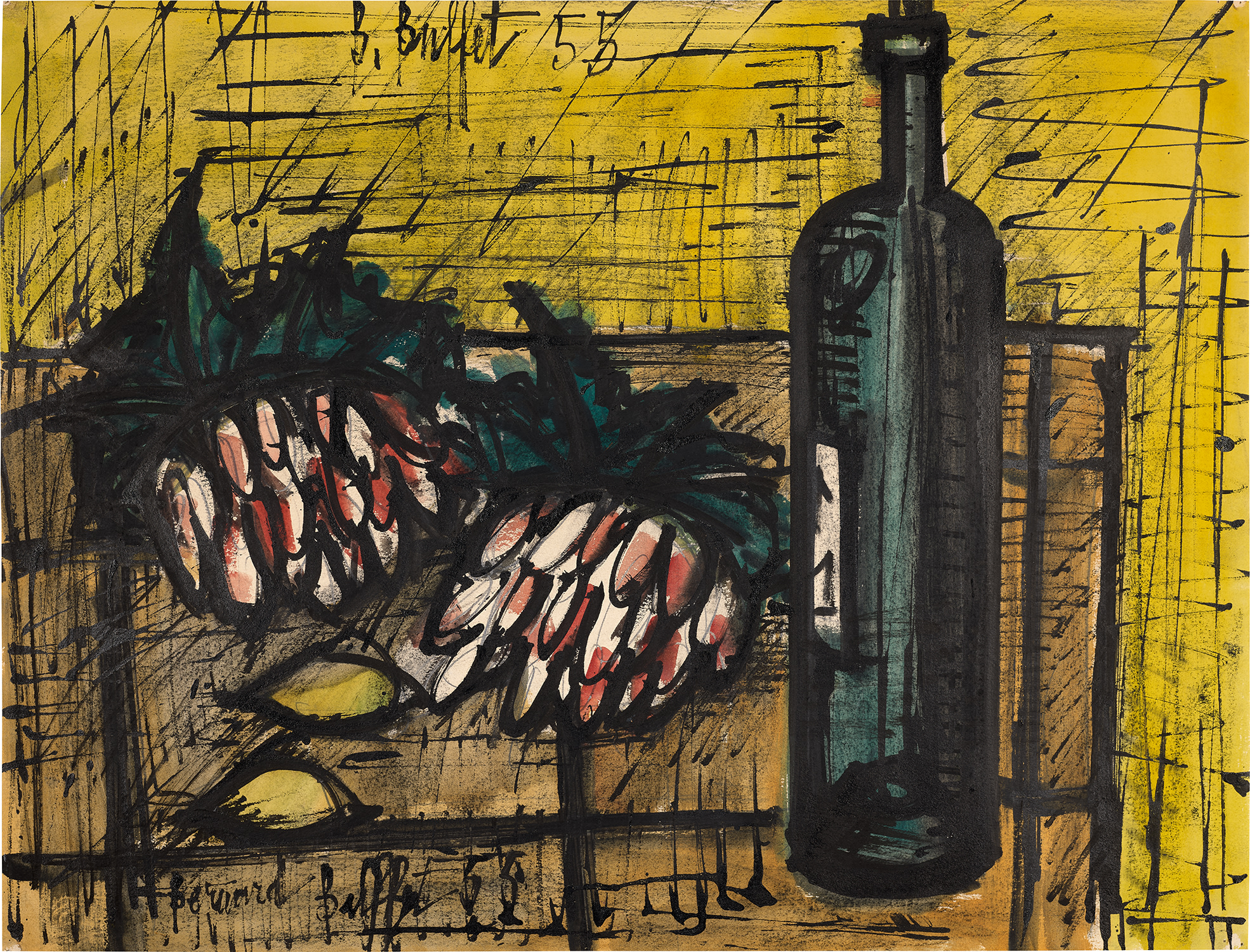 A striking example of Bernard Buffet's distinctive postwar style, *Les bottes de radis* (1955) depicts bundled radishes rendered with the artist's characteristic sharp, angular lines and muted yet expressive palette. The humble subject matter is elevated through Buffet's raw, almost austere approach, transforming an everyday vegetable into a study of form and texture. The work reflects the existentialist undertones prevalent in Buffet's output during this period, finding beauty and melancholy in the most ordinary of objects.