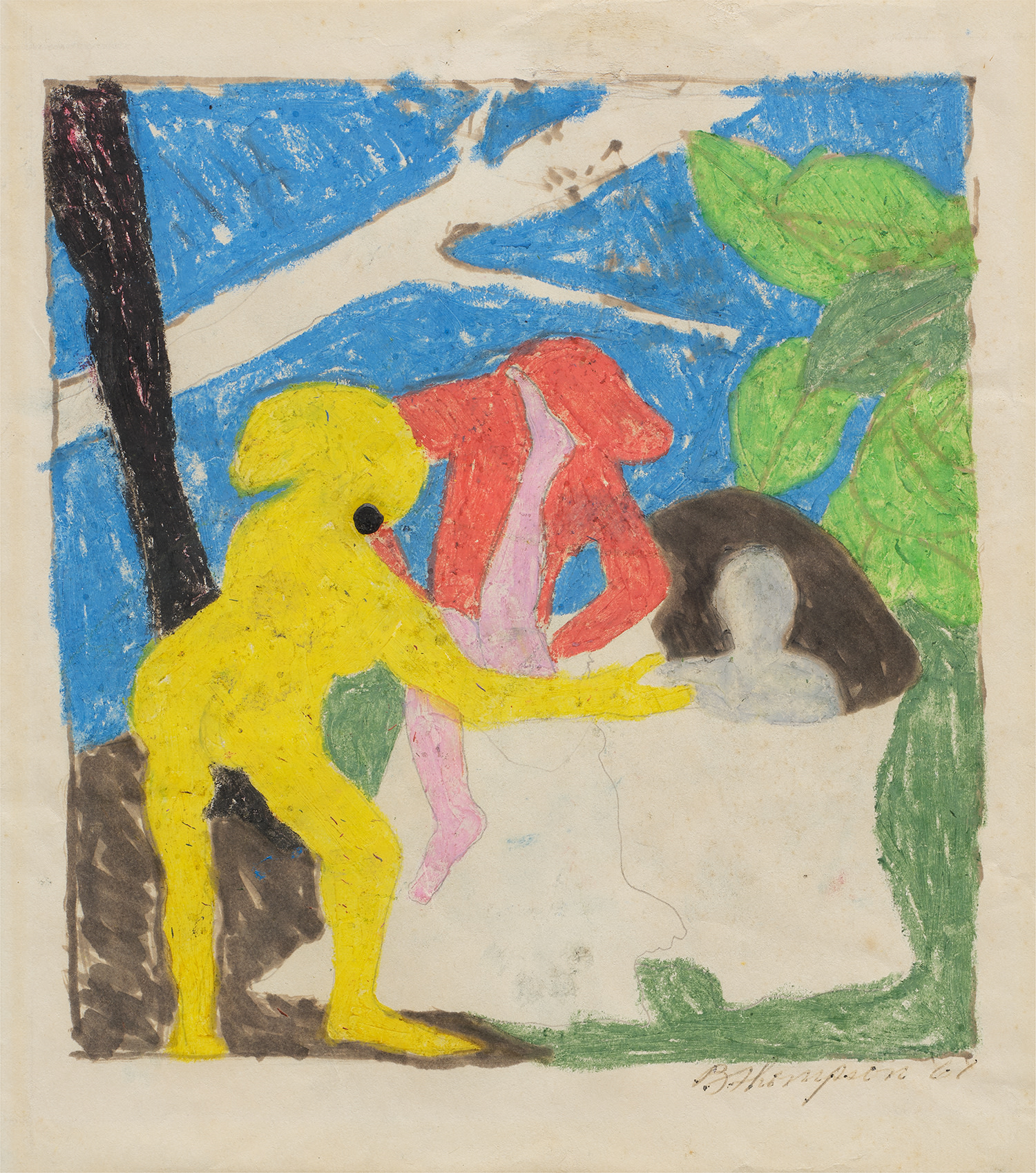 Bob Thompson's "Study for Four Bathers" is a preparatory work executed in mixed media that combines pencil, oilstick, and ink on paper to explore the artist's characteristic figurative compositions. The drawing demonstrates Thompson's dynamic approach to the human form, with the four figures rendered in gestural marks that balance spontaneity with structural consideration. As a study, the work reveals Thompson's creative process and his engagement with classical themes of bathing and the figure, subjects he frequently revisited throughout his career.
