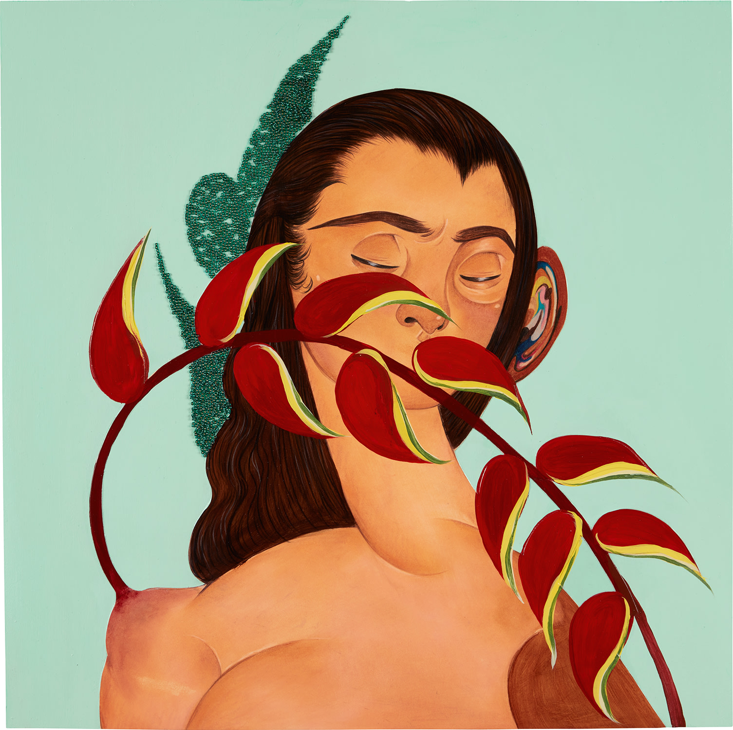 Bony Ramirez's 'Delonix Regalia' (2022) combines acrylic, colored pencil, and beads on panel to create a mixed-media composition. The work likely explores themes of natural beauty and ornamental detail through its layered materials and techniques.