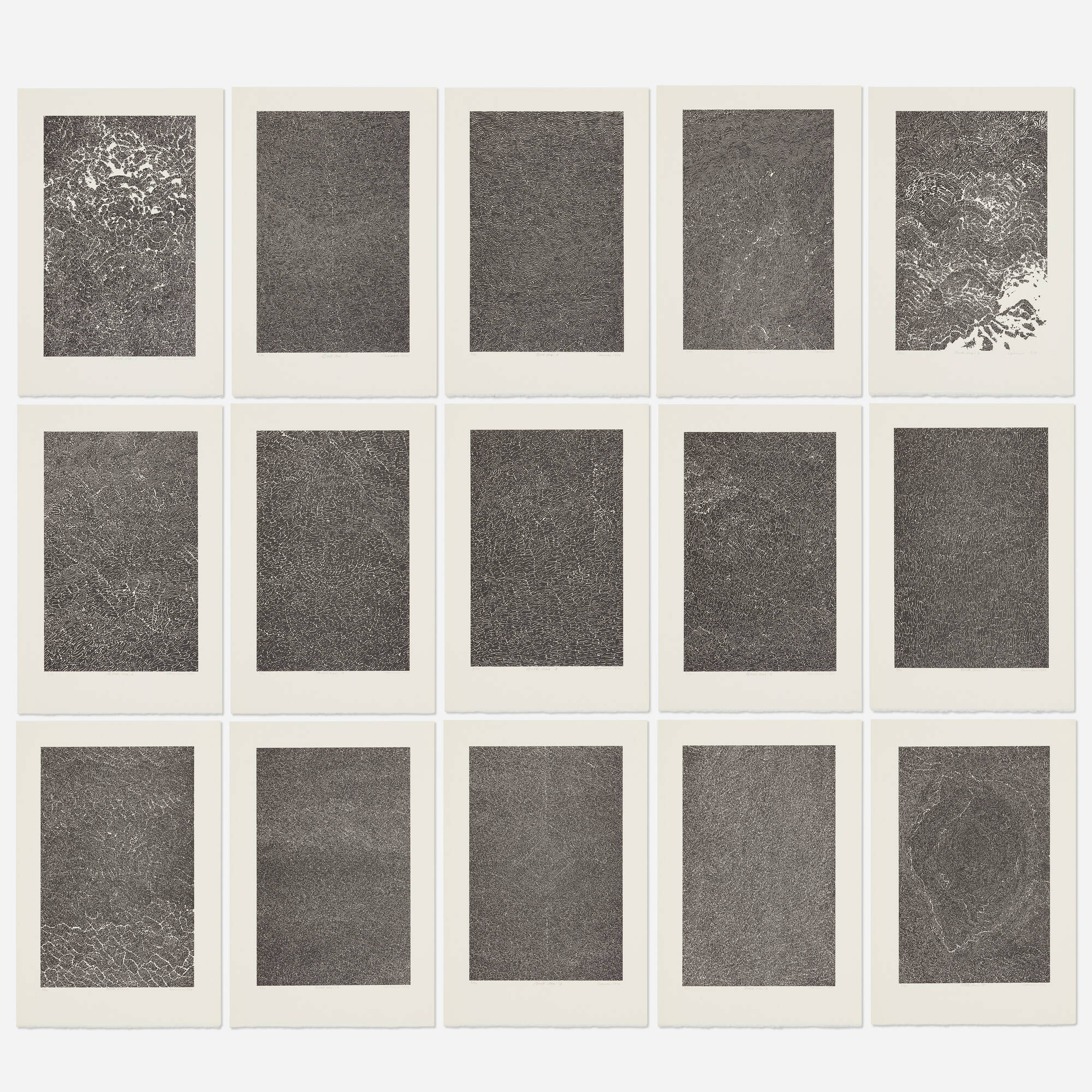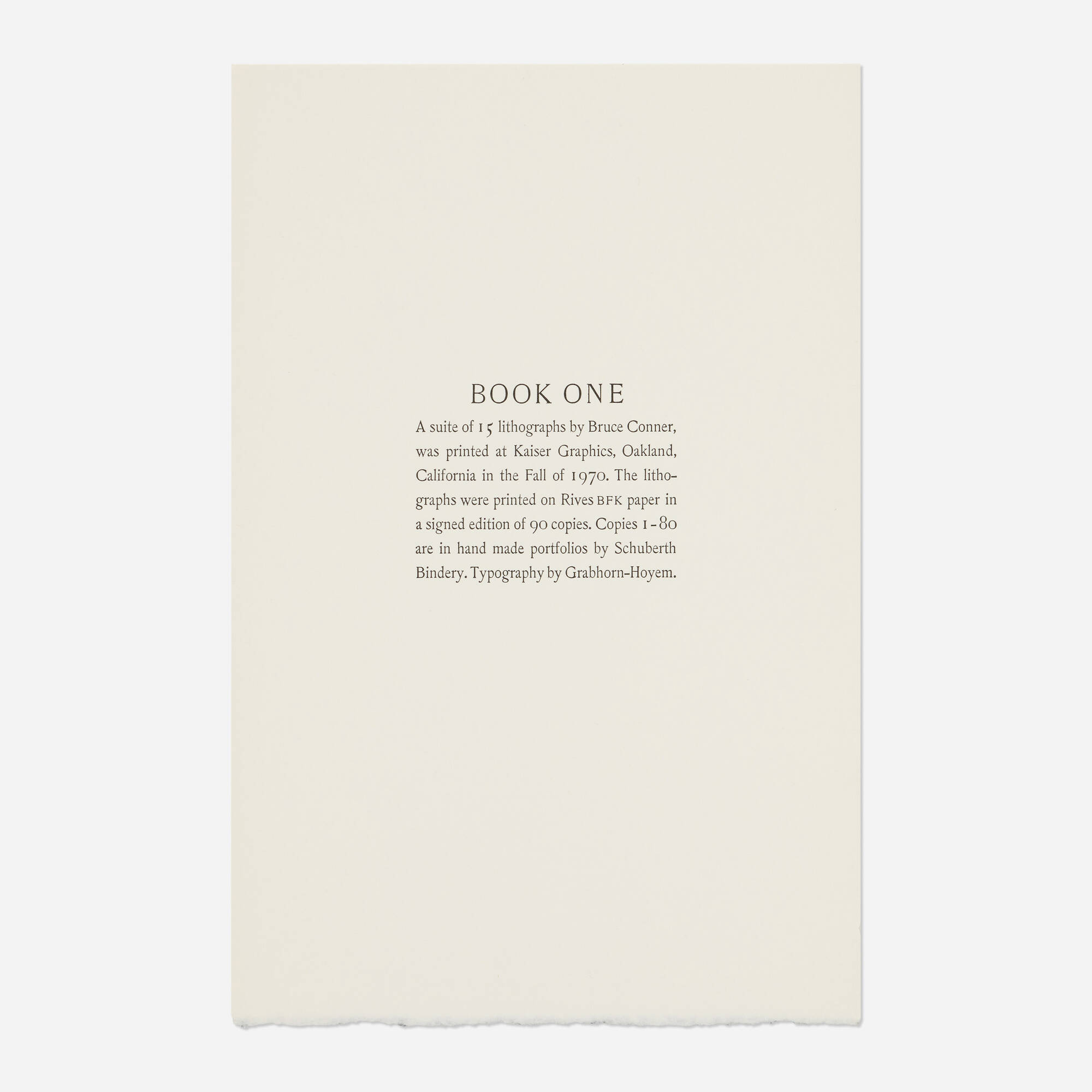 Signed, titled, dated and numbered to lower edge of each work ‘2/90 Book One: 1-15 Bruce Conner 1970’. This complete portfolio of fifteen works plus cover page is number 2 from the edition of 90 printed by Kaiser Graphics, Oakland with typography by Grabhorn-Hoyem. Sold with original handmade portfolio by Schuberth Bindery. Provenance: Acquired directly from the artist, Collection of Vivian Kurz