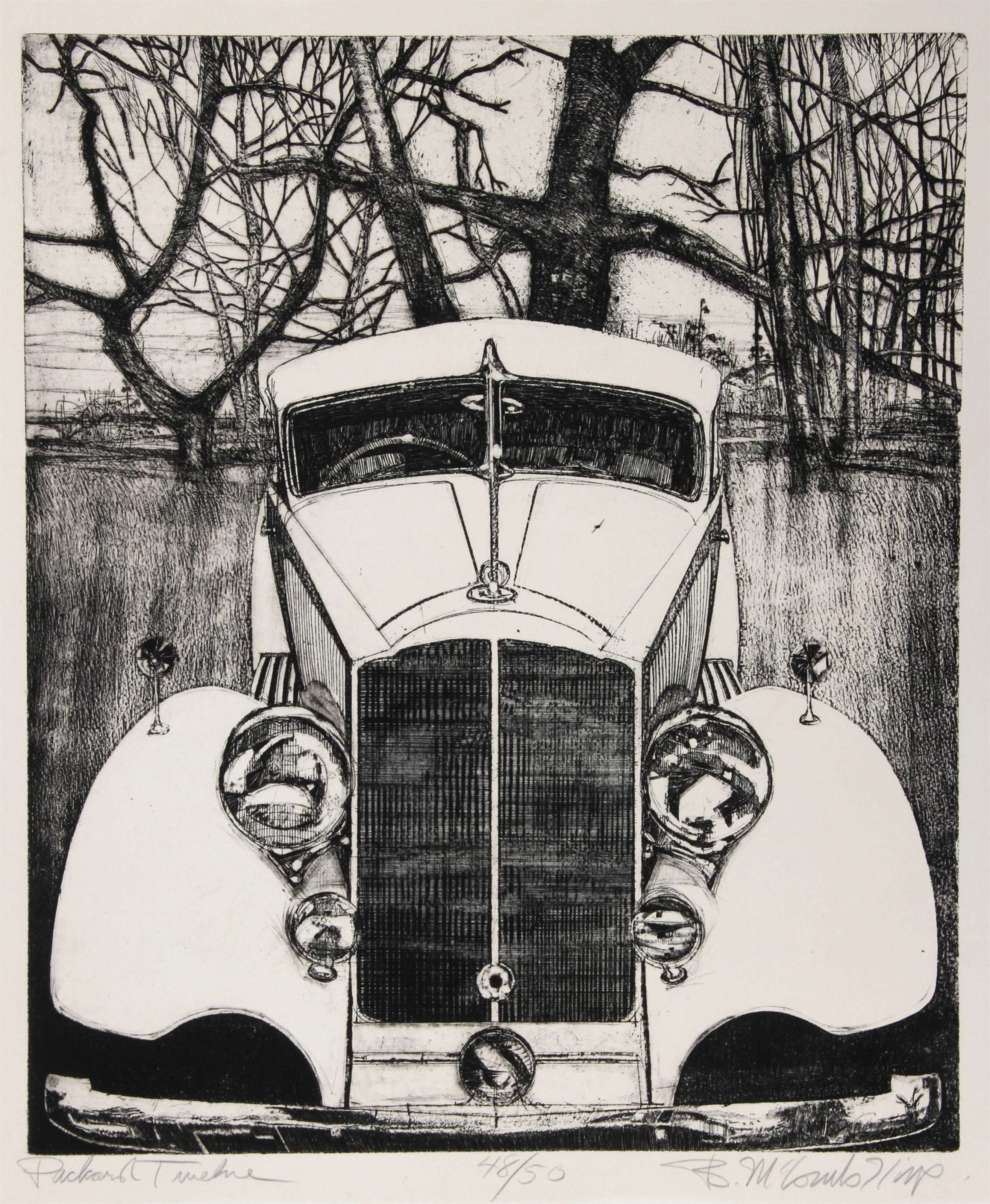 "Packard Twelve" is an etching by Bruce McCombs that depicts the elegant automobile of the same name, capturing the refined engineering and streamlined aesthetics characteristic of luxury cars from the early to mid 20th century. McCombs employs the etching medium to render fine linear details and tonal variations that emphasize the vehicle's sophisticated design and mechanical precision. The work reflects the artist's interest in documenting important examples of American industrial design through the traditional printmaking technique.