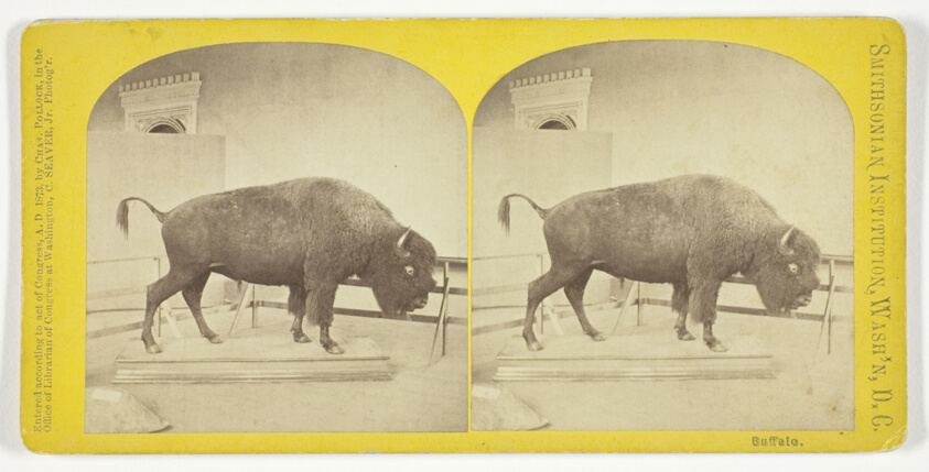 Part of the extensive 19th-century documentation of America's western expansion, this stereoscopic photograph captures the majestic buffalo that symbolized the untamed frontier before their near-extinction.