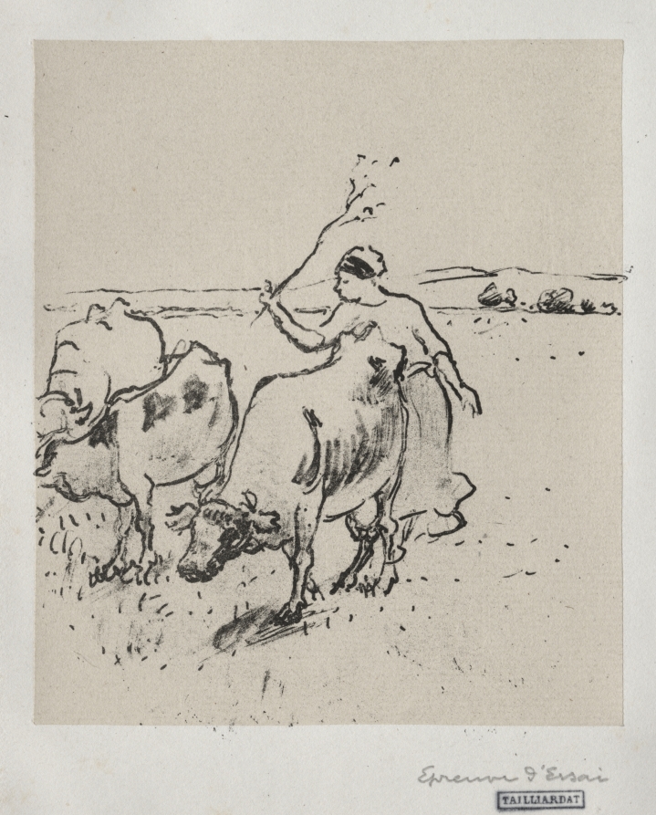 Rural pastoral life receives artistic treatment through zinc lithography enhanced with chine collé, a technique that adds textural richness to this scene of agricultural labor.