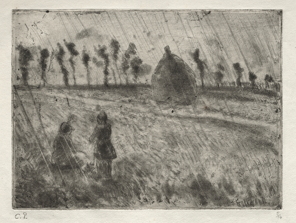 Atmospheric effects take center stage as Pissarro explores weather conditions through the subtle gradations achievable with combined etching and aquatint techniques.
