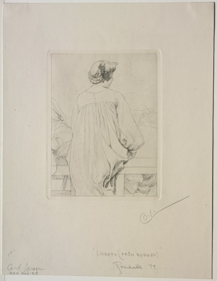 Intimate etching reveals Larsson's mastery of the medium and his ability to find artistic beauty in everyday domestic moments, characteristic of his celebration of Swedish family life.