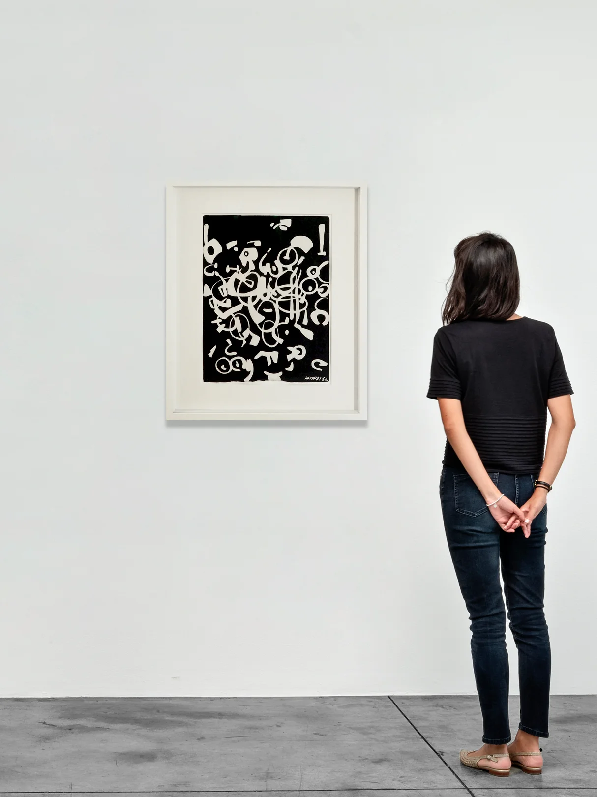 This untitled work from 1954 showcases Carla Accardi's pioneering approach to painting, created quickly on the floor using casein tempera on paper. The artist employed unconventional techniques, working with brushes and cans of paint while kneeling or walking across the surface, rejecting traditional easel painting methods. This groundbreaking practice challenged the artistic conventions of her time and established her innovative methodology that would define her career. The work exemplifies her desire to break free from established drawing and painting traditions through gestural, process-driven abstraction.